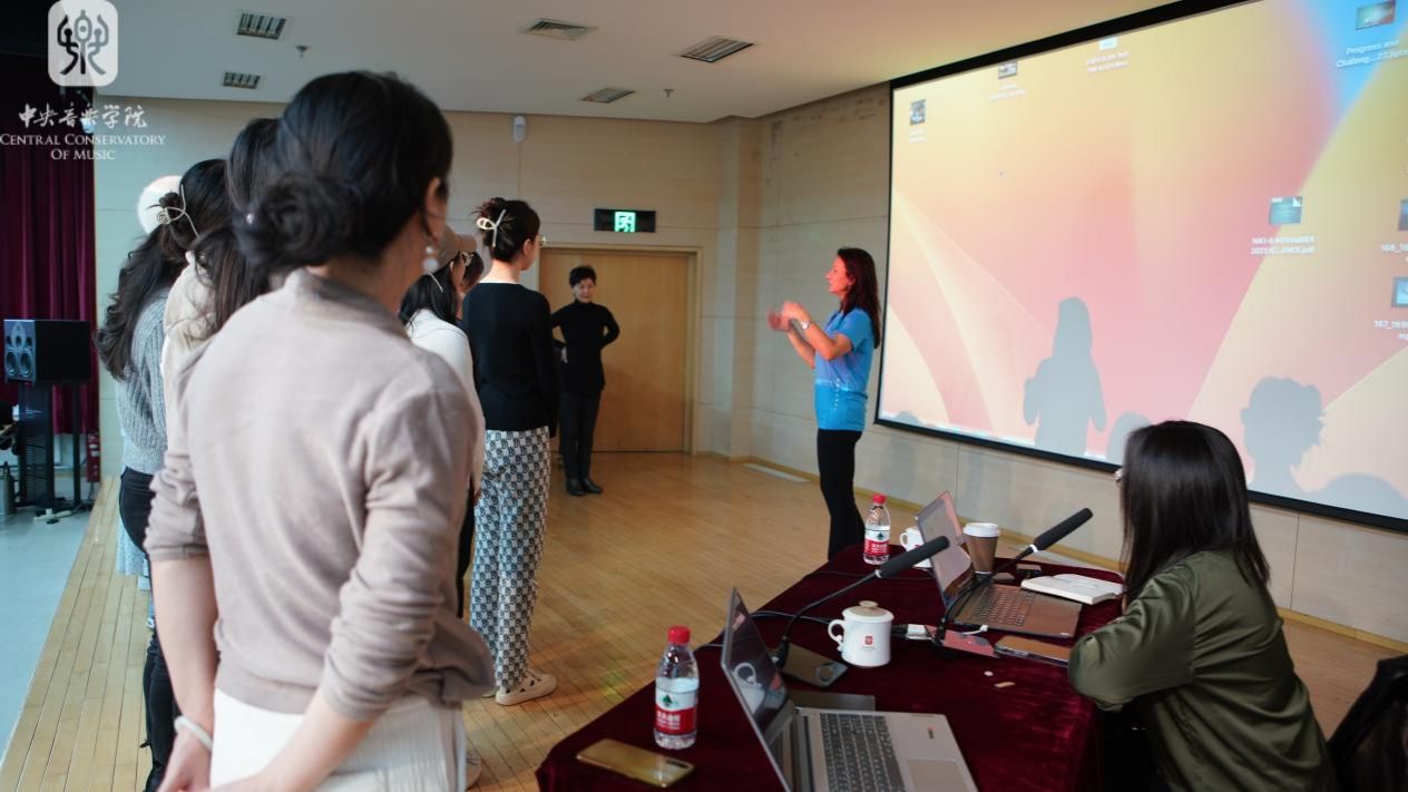 在随后的“土耳其民间音乐与舞蹈”工作坊,Muslu博士简要讲述了土耳其木卡姆的特点,并带领大家模唱“乌苏尔”(usul)的节奏韵律。最后,她邀请全体在场师生上台,共同体验土耳其舞蹈的艺术魅力。