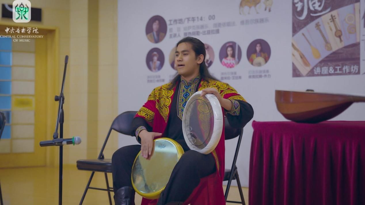 下午,哈萨克族器乐、阔麦依唱法、维吾尔族器乐工作坊邀请了中央民族大学音乐学院少数民族器乐系教师穆热阿勒·比目拉提作为主讲人,他与五位新疆传统音乐表演者对新疆代表性的维吾尔族器乐、哈萨克族器乐、阔麦依唱法进行了讲解与展示。