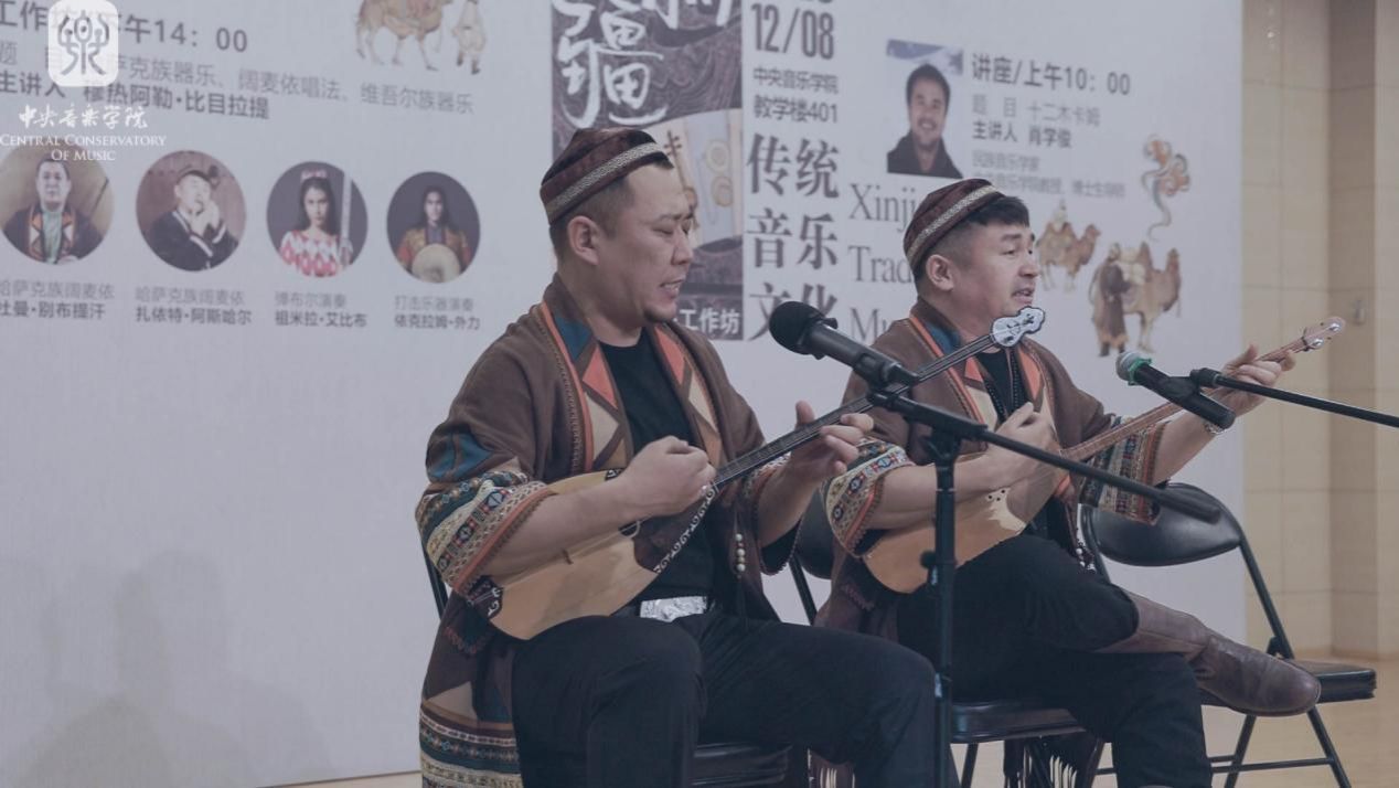 阔麦依唱法是哈萨克族古老的演唱形式,是一种“喉音”唱法,即演唱者运用特殊的声音技巧,一人同时唱出两个声部。此次工作坊邀请到自治区级非物质文化遗产代表性传承人杜曼·别布提汗和扎依特·阿斯哈尔,两位表演者以边弹边唱的方式展示了精湛的阔麦依演唱技巧。