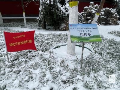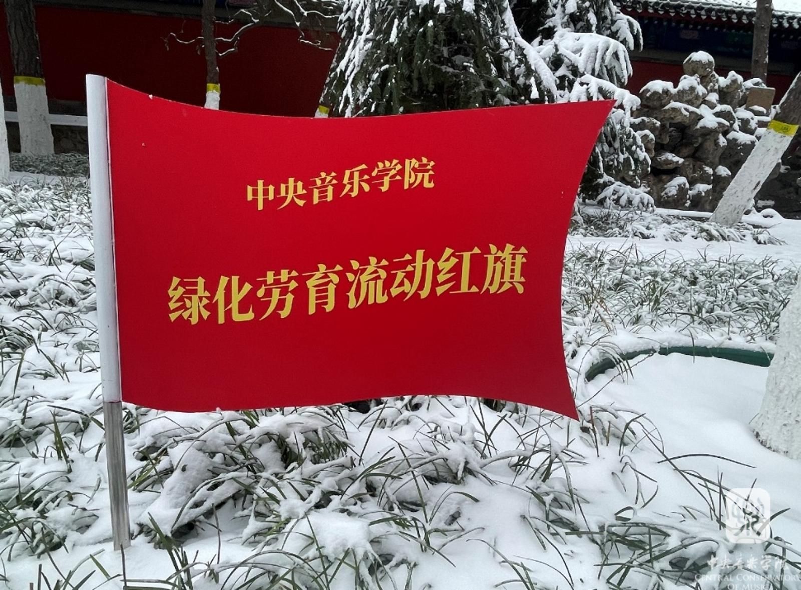 此次劳动教育实践课程还评选出第一个流动红旗:指挥系劳动教育实践责任区(叮咚园)。12月11日,北京的第一场雪后,一面鲜红的红旗在指挥系劳育实践责任区(叮咚园)飘扬。祝贺指挥系!