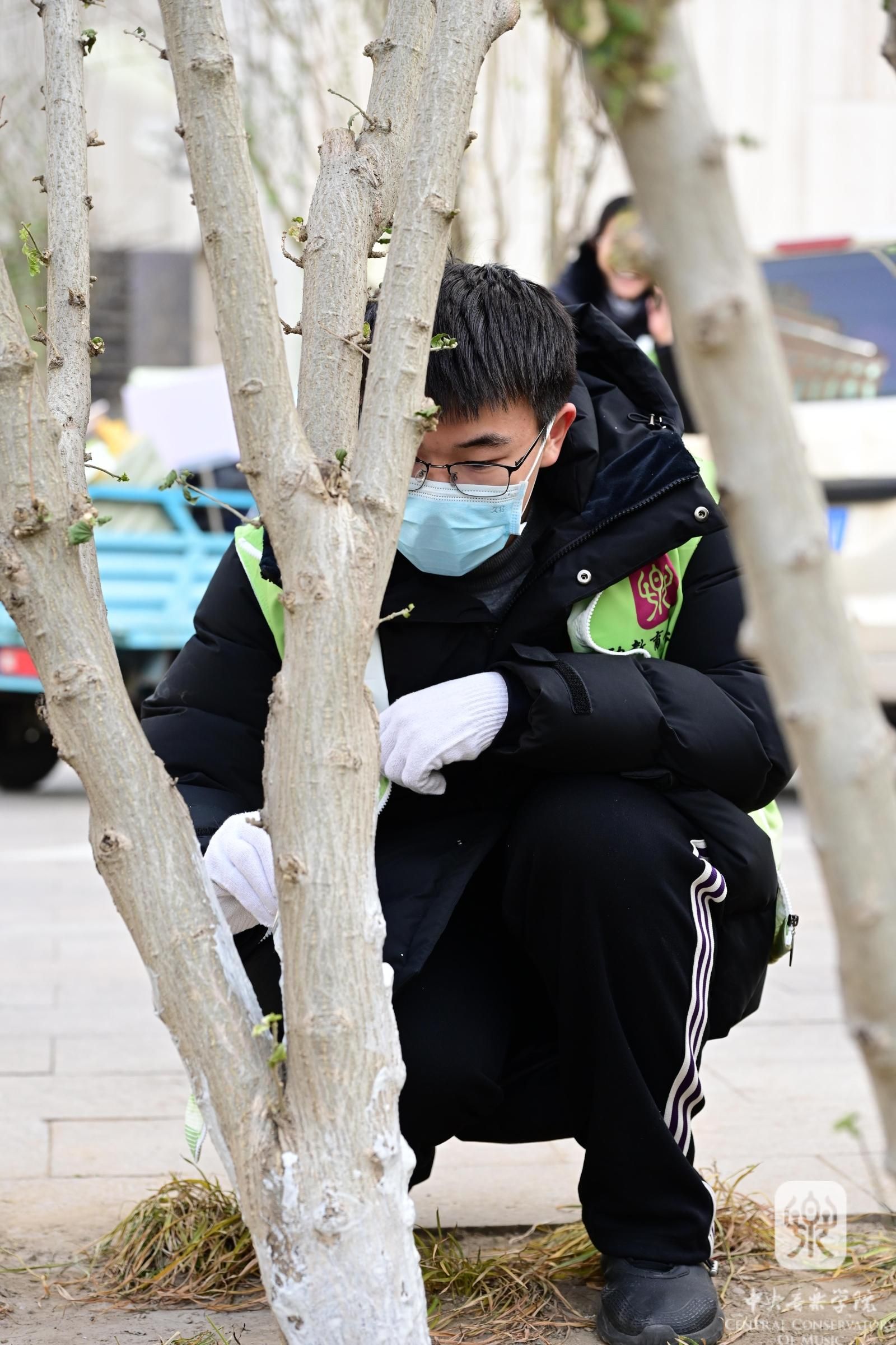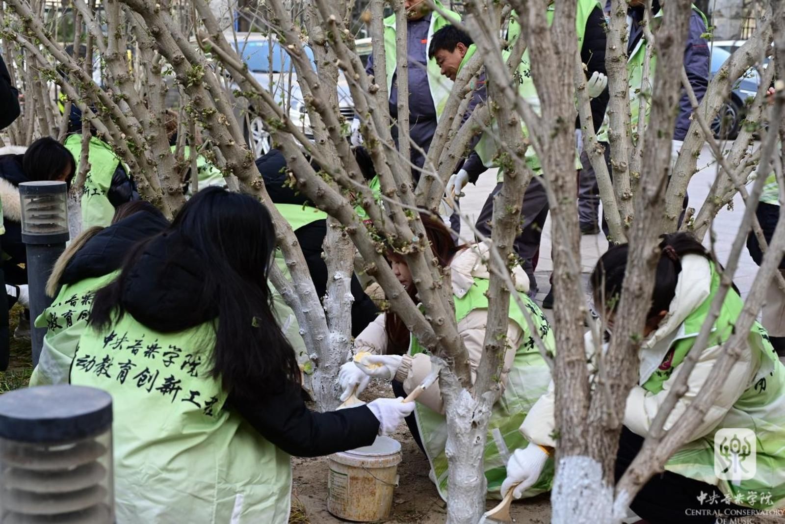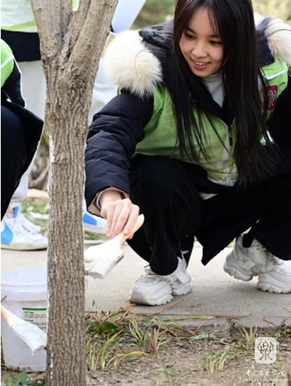 除为树木“盖被子”外,同学们还参加了为树干“刷白”穿“裙子”的劳动。树干刷上一层白色的液体、穿上石灰水打造的“白裙子”,能把部分阳光反射回去,如此这般,吸热减少,树干就不会因昼夜温差巨大而冻裂,同时还有杀菌和防虫的作用。同学们踊跃上手实践之后纷纷表示与设想的难易程度大大不同,这项工作不仅容易将“白漆”迸溅到自己的身上,还很难在树干上着色,需要学习专业手法,迅速上下反复不同方向地涂抹才行。
