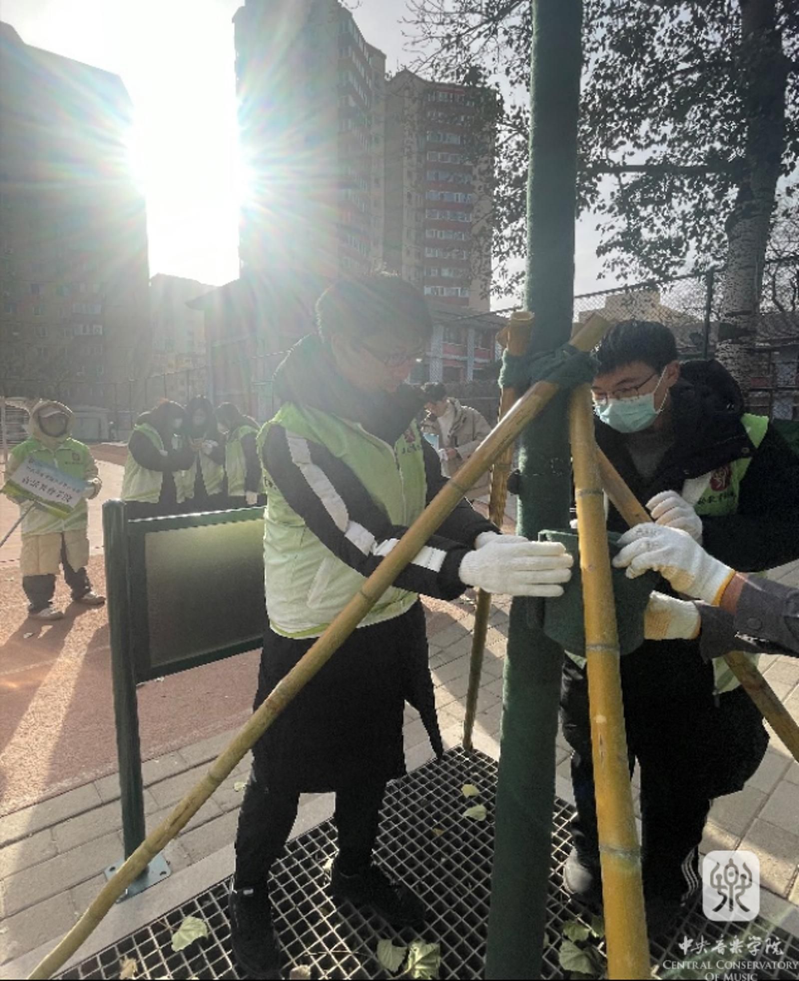 学生给绿化园区的小乔木、花灌木及部分大叶黄杨绿篱做防寒围挡