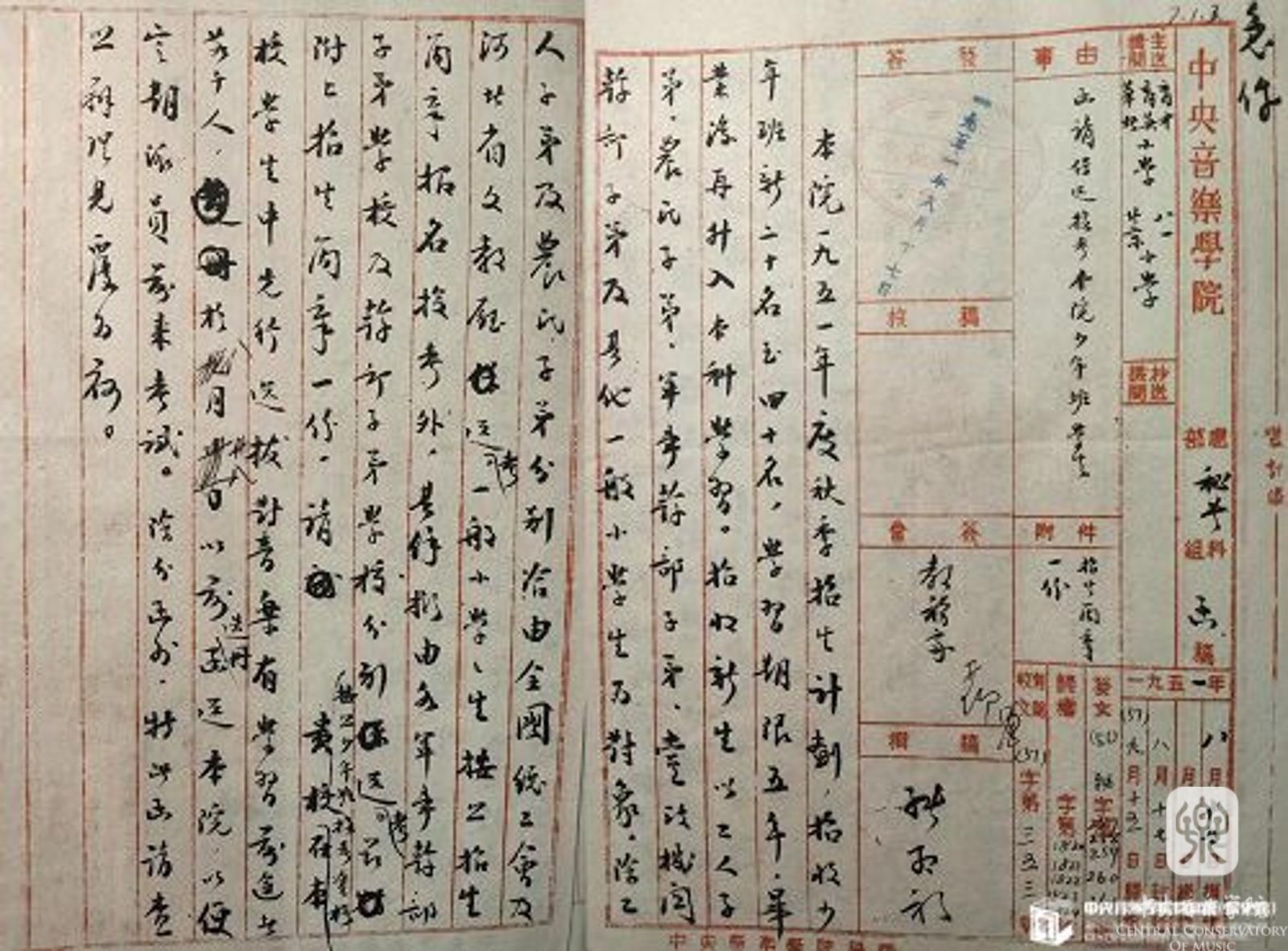 5月8日学校在递交文化部的报告中提出:“关于联合招生一事,本院情况与一般大学不同,许多课目为个别考试,参加联合招生颇有困难,业已报告教育部在案。至于今年暑期招生,本院是否应与戏剧、美术两院在钧部领导下统一办理?拟应单独办理,尚请早赐裁决批示……”,⑨6月8日,学校接到文化部通知:“……你院今年暑期招生可单独办理,不须与戏剧、美术两学院联合举行……”