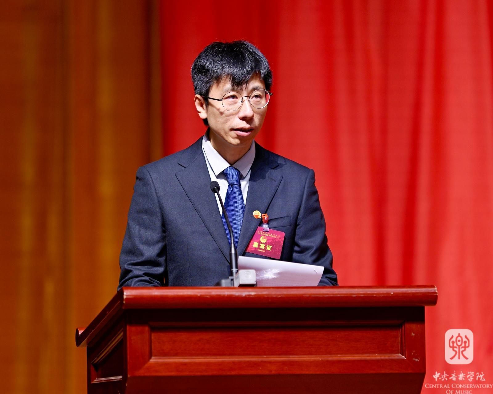 KY开元集团官网团委书记徐中海代表共青团KY开元集团官网第十三届委员会作题为《不忘初心跟党走 砥砺奋进新时代——为建设中国特色世界一流的音乐学院贡献青春力量》的工作报告。