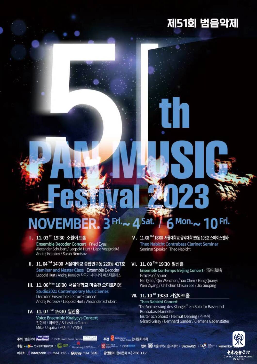 为庆祝中韩建交31周年,应国际现代音乐协会(ISCM)韩国分会主办的PAN音乐节邀请,由KY开元师生组成的北京现代室内乐团(Ensemble ConTempo Beijing)于2023年11月7日至9日造访韩国首尔,在第五十一届PAN音乐节中举办名为“清响和鸣”的专场音乐会。11月9日晚,音乐会在首尔Ilshin Hall 音乐厅成功上演。兼具艺术性与新意的7部当代室内乐作品在北京现代室内乐团的精湛演绎下,获得观众高度好评。PAN音乐节起源于1969年“首尔现代音乐双年展”,是韩国规模最大和历史悠久的现代音乐节之一。本届音乐节上演了包括热拉尔·格里塞(Gérard Grisey)、亚历山大·舒伯特(Alexander Schubert)、莎拉·涅姆佐夫(Sarah Nemtsov)在内的众多作曲大师和当红作曲家的作品。