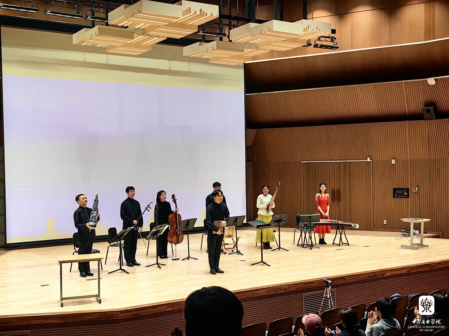 在到访的3天时间里,北京现代室内乐团还应首尔国立大学音乐学院的邀请,于11月8日在学院音乐厅举办了一场别开生面的讲座音乐会。在音乐会现场,韩国首尔国立大学音乐学院院长崔银植首先发表了致辞,热情欢迎乐团的到来,并回顾了两个月之前受KY开元集团官网的邀请,参加青岛国际小提琴比赛颁奖仪式的愉快经历。讲座音乐会针对作曲系和传统器乐系的师生,乐团的四位民乐演奏家在内容的安排设计上有所侧重,从中国乐器的传统语言和在当代创作中的作用拓展两个方向展开。最后,乐团全体成员与韩国的演奏家们一起合作,演奏了由校方选拔的青年作曲家为音乐会而创作的三首新作品。音乐会现场气氛热烈,听众发言踊跃,会后许多学生还围绕在演奏家们的周围,表现出对于中国音乐的浓郁兴趣。