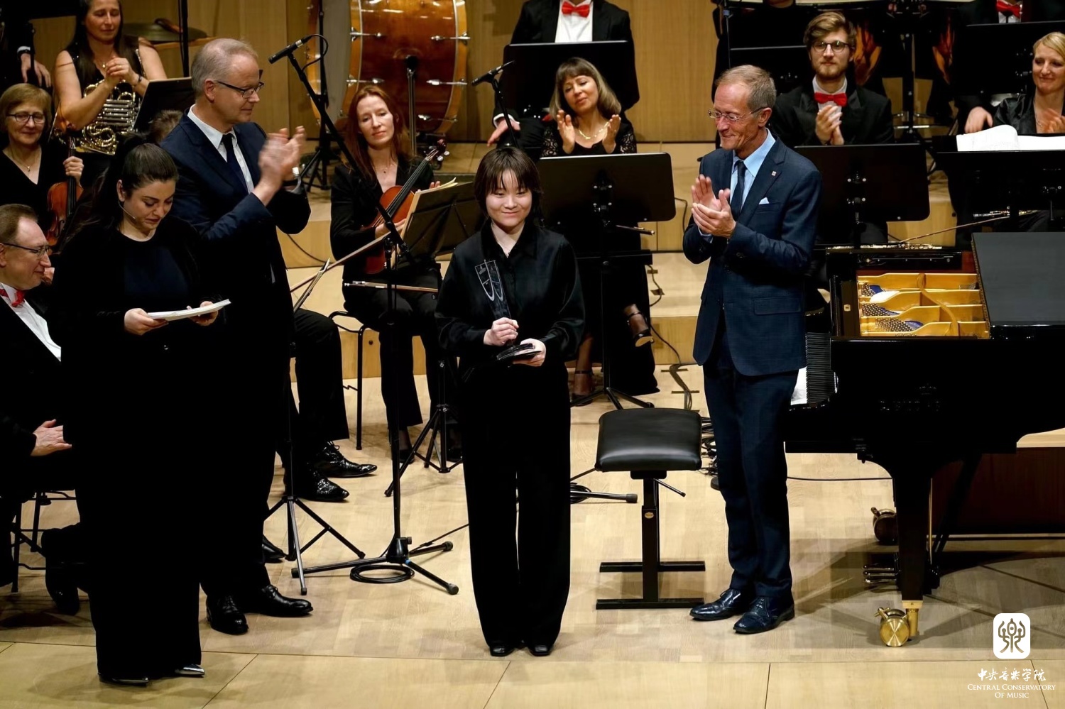 毛宣懿同学于十月底收到比赛方的邀请,当时她还在莫斯科柴可夫斯基音乐学院访学,由于在俄罗斯无法办理签证手续,几经周折导致11月23日下午才拿到签证,经过十几个小时转机和飞行于24日早晨5点多到达法兰克福。她一下飞机就直奔赛场,两天内经过四轮——10进4、4进2的激烈角逐,最终获得观众奖和“Arnold Freymuth Special Prize”决赛奖(赛事历史上首次颁发)。