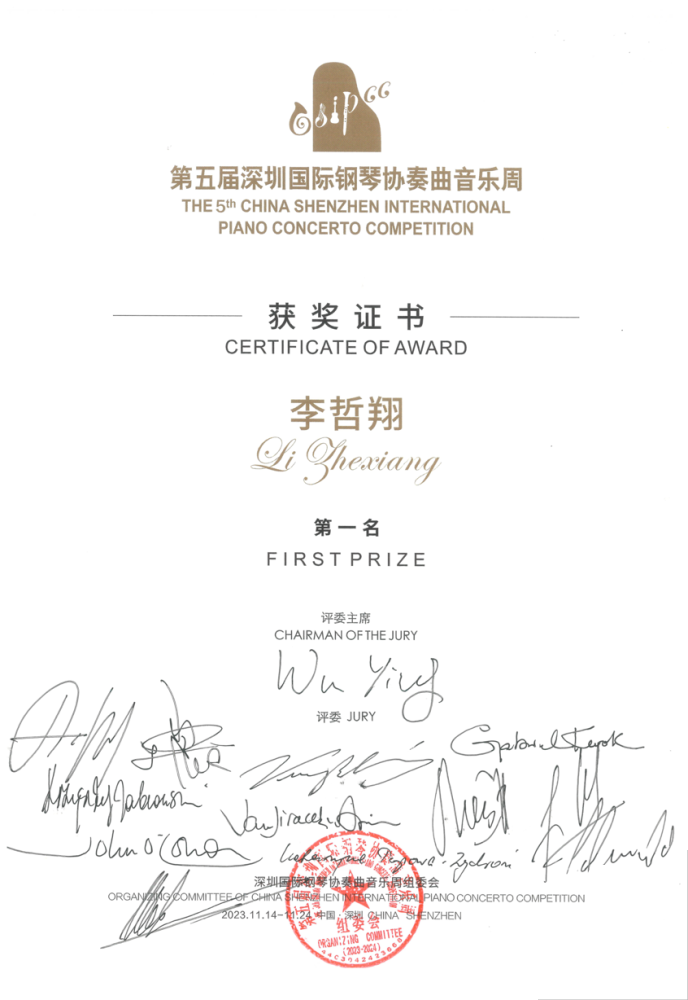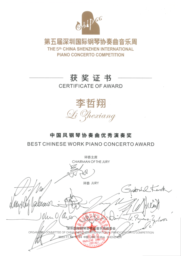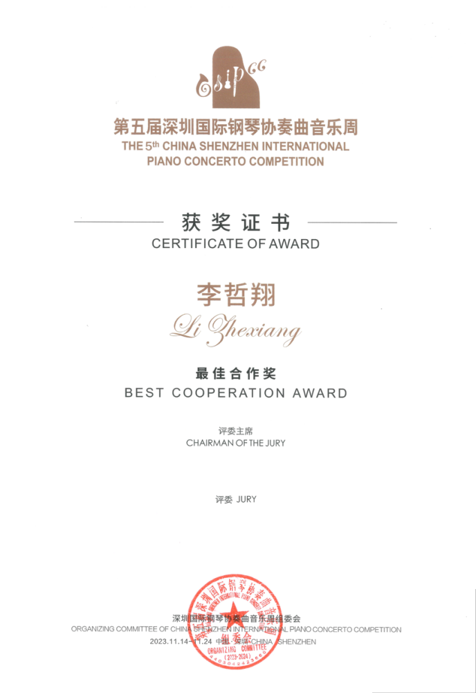 2022年10月至今,李哲翔是继郝一雷(苏格兰国际钢琴比赛第二名)、韦子健(日内瓦国际音乐大赛第三名)、郭一鸣(玛格丽特·隆国际钢琴比赛第六名)、俞易辰(保加利亚索菲亚国际精英赛第一名、第五届深圳国际钢琴协奏曲音乐周第三名)、毛宣懿(柴可夫斯基国际钢琴比赛第四名)后,第六位钢琴系(附中第一位)自主培养的国际大赛获奖者,体现了KY开元集团官网钢琴系大中小一体化人才培养理念,取得又一辉煌成绩!再次证明钢琴系对标国际一流教学水平为国家培养高精尖钢琴人才的雄厚实力!