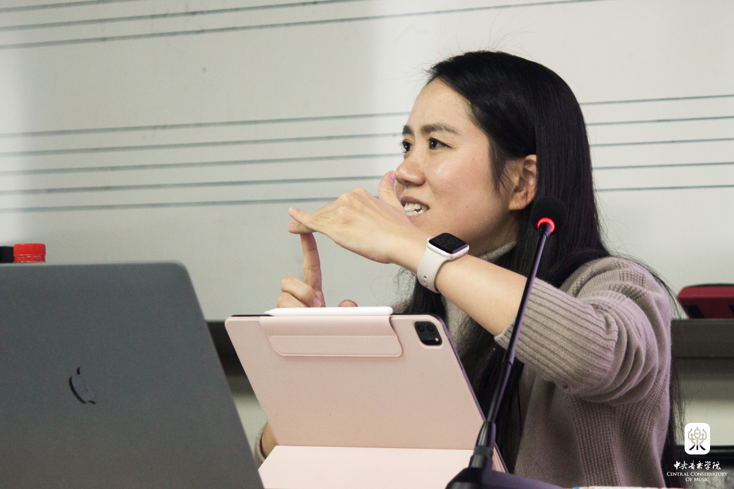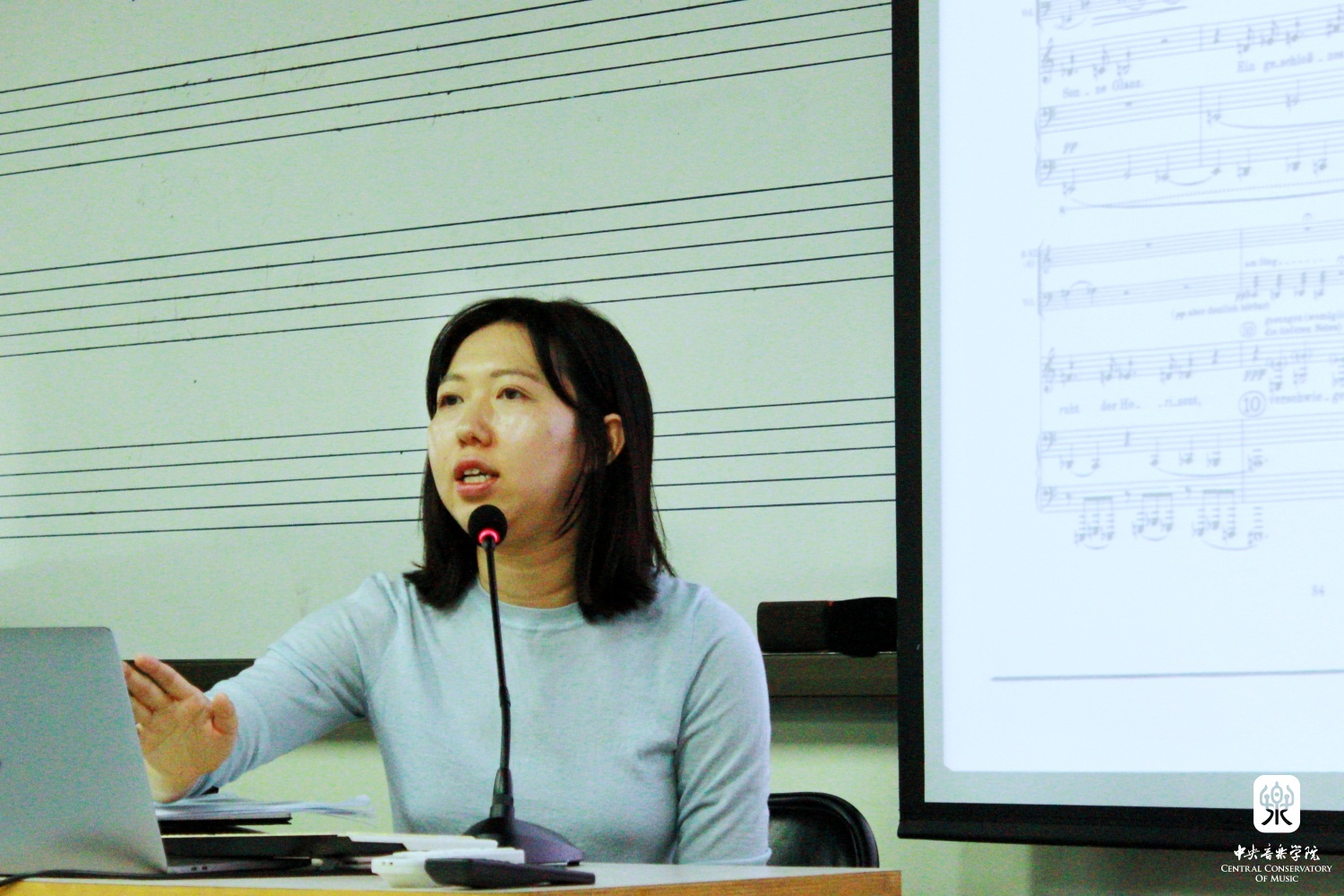 郑老师主要从历史文献的角度梳理了全音阶、八声音阶、六声音阶、变调式等新音阶的发展脉络,并着重梳理不同时期的作曲家如何创造性的将新音阶变化并运用于自己的创作中,从而实现对音乐作品音响效果的可能性与色彩性的拓宽;她也以实例阐述了理论家是如何通过创立一种理论来诠释已有作品并使理论与作品本身相适应;