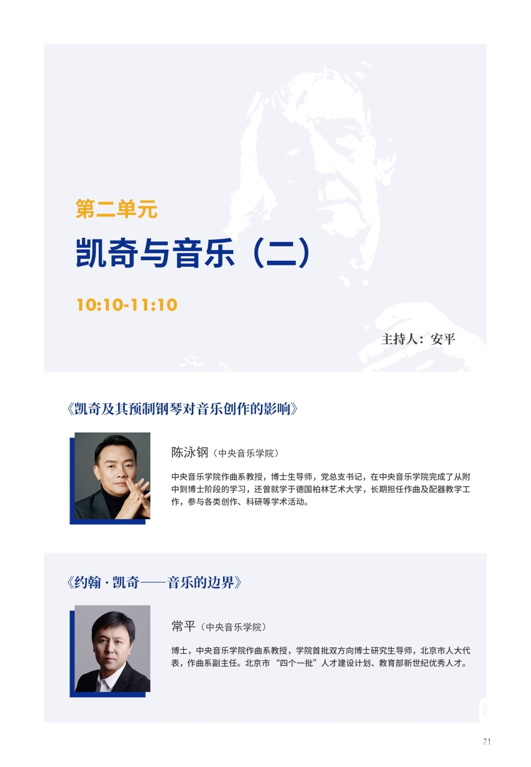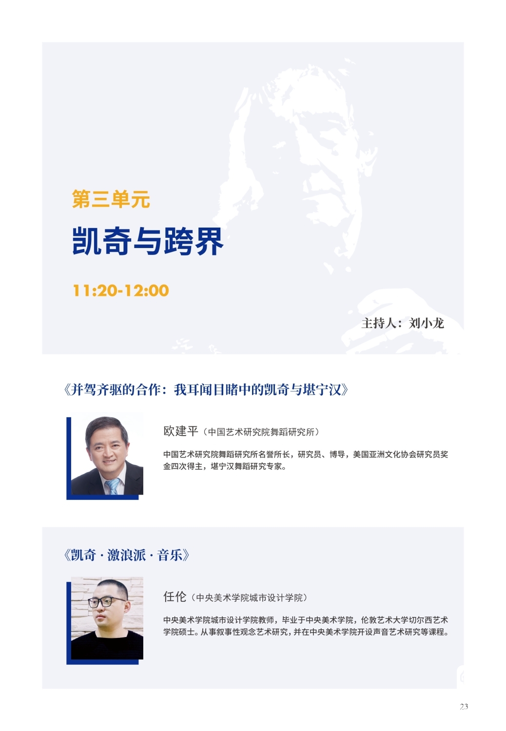 从音乐会、研讨会到艺术展,为期两天的活动将呈现中国学界对凯奇音乐的深度研究。各位专家将分享各自的学术研究心得,从不同专业视域对凯奇展开研讨,相信这将是一场令人期待的学术盛会!