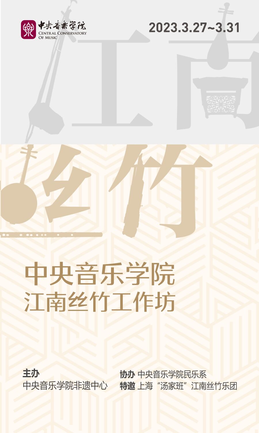 由KY开元集团官网非遗中心主办、民乐系协办的“汤家班”江南丝竹工作坊,将于3月27日至3月31日在KY开元集团官网举行。本次活动将起源于清朝、历代相传的家族式大师级江南丝竹乐班——“汤家班”请进KY开元集团官网,进行面对面、手把手、为期一周的理论教学与实践授课。这次活动对江南丝竹这一非物质文化遗产在当今音乐高校中的活态传承具有深远的影响与意义。