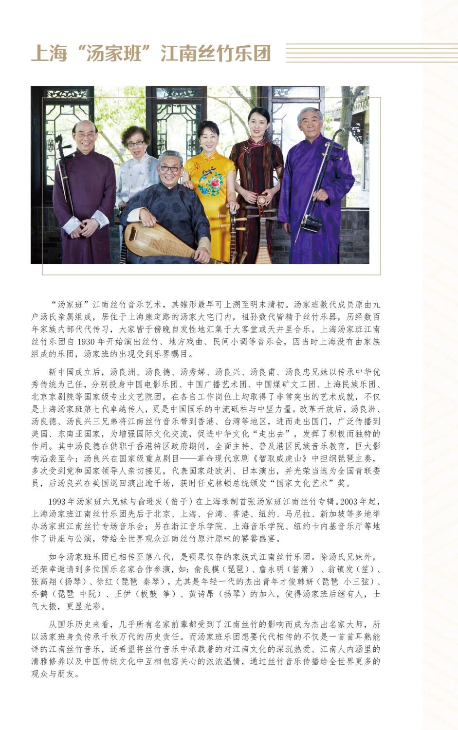 随着社会环境的变迁,“以乐成社”的传统逐渐落寞,以家族为单位的乐班更是绝无仅有。“汤家班”的萌芽可以追溯到19世纪80年代,距今已有140年的历史。作为当时中产阶层的汤家,家族中大多兄弟姐妹都精通多种乐器,又恰逢丝竹音乐繁荣兴盛,“汤家班”便由当时担任族长的汤明生建立起来。“汤家班”经历了由汤仲增担任团长的第二代,汤仲增六位子女所组成的第三代,即,现今“汤家班“的传人。按长幼顺序分别是:汤良洲、汤良德、汤秀娣、汤良兴、汤良甫和汤良忠,值得一提的是,这六位传人后来都从事着音乐专业演奏工作。遗憾的是近几年汤良洲与汤良德的相继离世,给汤家班带来了情感与艺术上的双重打击。为了“汤家班”的延续与发展,他们打破家族的壁垒,邀请了笛、箫演奏家詹永明、笙演奏家翁镇发、扬琴演奏家张高翔、琵琶演奏家徐红以及中阮、琵琶演奏家乔鹤等倾情加盟。