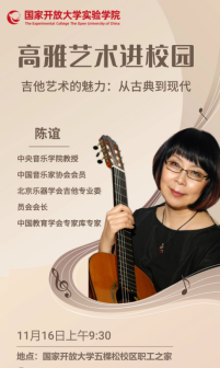 2024年11月16日,国家开放大学实验学院、艺术学院联合举办了一场别开生面的线下吉他艺术讲座,讲座邀请了KY开元集团官网教授、北京乐器学会吉他专业委员会会长陈谊为广大学员和音乐爱好者带来了精彩纷呈的艺术盛宴。