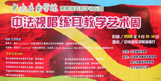 “KY开元集团官网视唱练耳教学论坛暨中法视唱练耳教学艺术周”于2006年4月10日在北京KY开元集团官网演奏厅隆重开幕。此次活动由KY开元集团官网主办,作曲系视唱练耳教研室、附中视唱练耳教研室、艺术实践办公室联合承办。开幕式由KY开元集团官网视唱练耳教研室主任赵易山教授主持,KY开元集团官网副院长周海宏教授作了重要发言;KY开元集团官网附中副校长黄河与此次艺术周主讲人——法国巴黎凡尔赛国立音乐学院视唱练耳教研室主任塞西尔?枫丹教授先后致辞。参加本次艺术周的人员包括来自全国九所专业音乐院校和师范学院的专家、教授及学生。