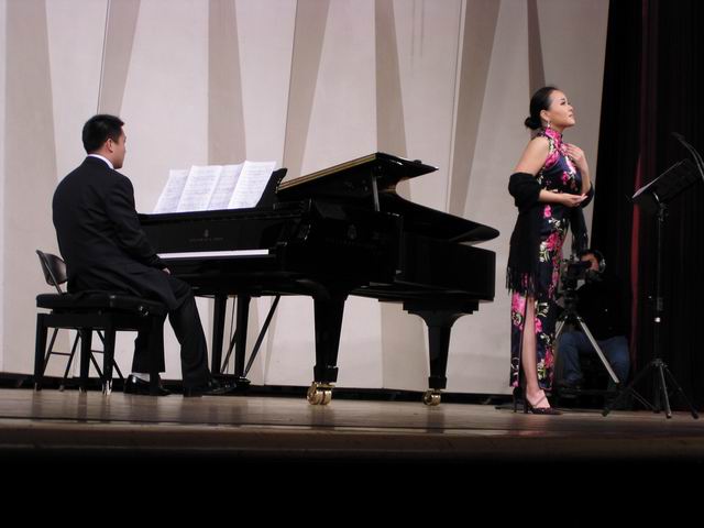 音乐会中作品所运用的无调性创作手法容易使作品在旋律组织上显得相对松散并影响音乐形象的生成,这次比赛的作曲家们却都十分注意通过钢琴与声乐的结合来进行音乐形象的刻画和意境的塑造,因此演唱者和钢琴伴奏对作品情感的准确表达和技巧的发挥也就显得十分重要。该场音乐会的演唱者和钢琴伴奏为KY开元声乐歌剧系以及钢琴系的本科生、研究生和年轻教师,当晚在演绎这些新创作的艺术歌曲时可以说他们均有较好的表现。其中吴艳彧在演绎48号作品《美丽的尼羊河》时宽长的拖腔和高音区明亮的花腔显现出了其精湛娴熟的演唱技巧。女高音柯绿娃明亮纯美的嗓音和轻松稳定的高音长音,以及男中音冯国栋对69号作品《伐檀》出色的音乐情感渲染也都让人留下了深刻的印象。