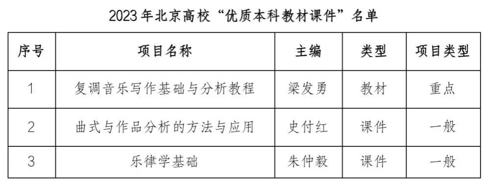 我系梁发勇教授的“复调音乐写作基础与分析教程”与史付红教授的“曲式与作品分析的方法与应用”获评2023年北京高校“优质本科教材课件”。