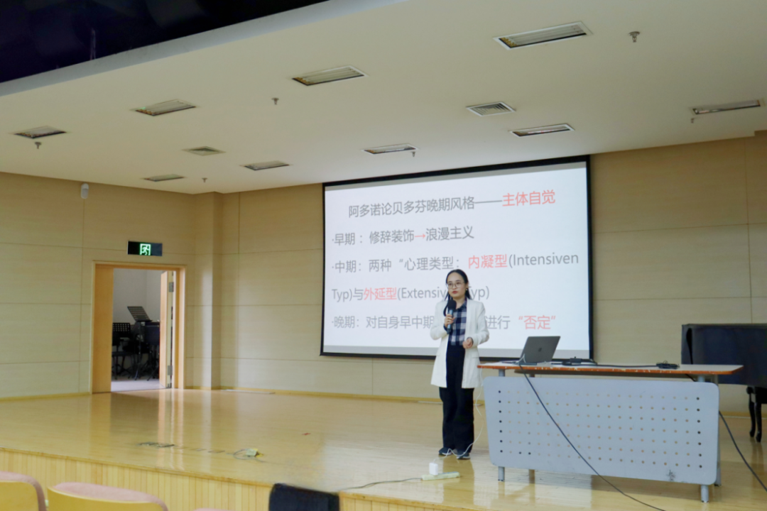 第一位演讲者2024级音乐美学方向博士研究生冯钰文以《从阿多诺到斯皮策——两种贝多芬晚期风格理论的研究》为题,她从容不迫,收放自如,有很好的控场能力,围绕两种贝多芬晚期风格理论展开讨论,激情响亮的声音为本次活动开了一个好头。