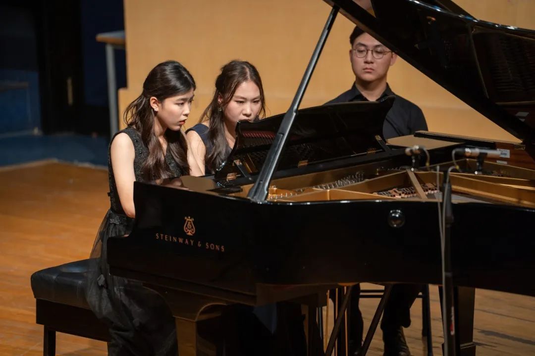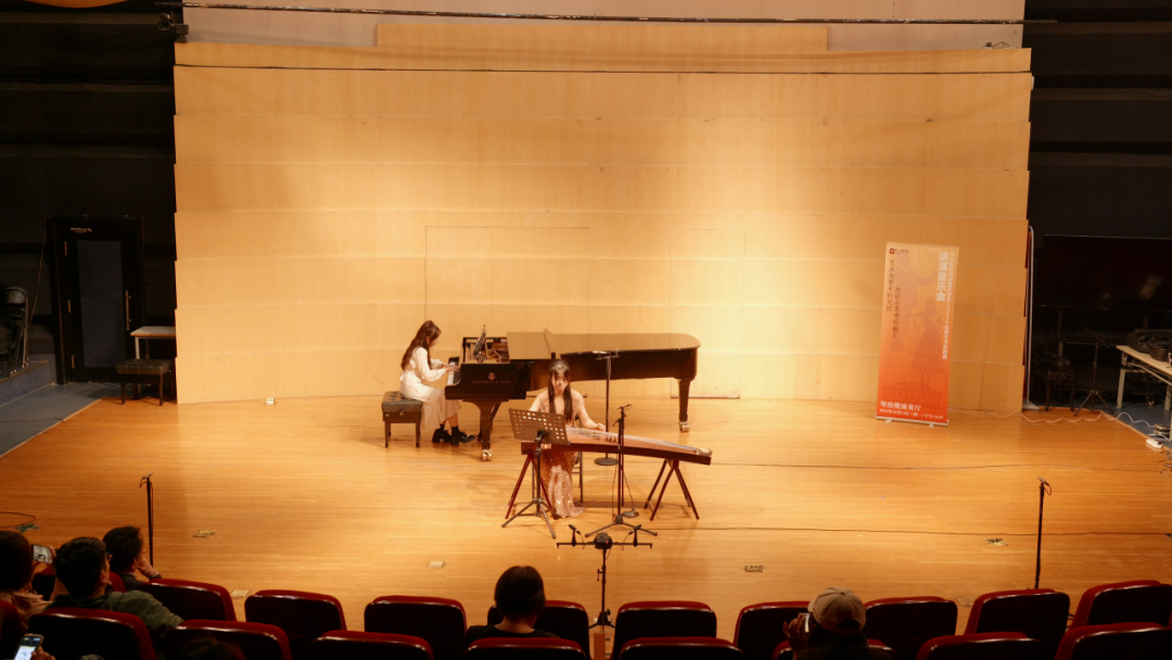 曹雅棋和张典艺在演奏古筝与钢琴二重奏《春江花月夜》中,通过古筝行云流水般的点拨和钢琴轻柔的触键,营造出花前月下、花好月圆的安谧氛围。