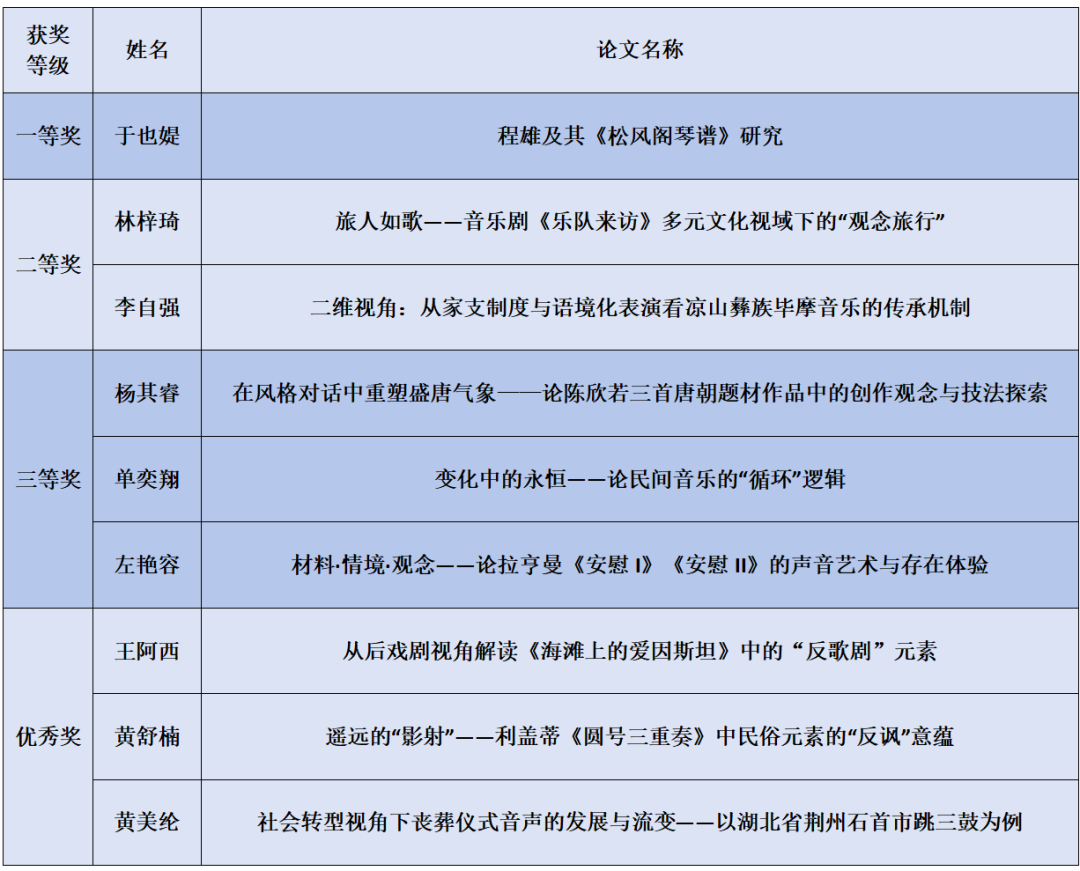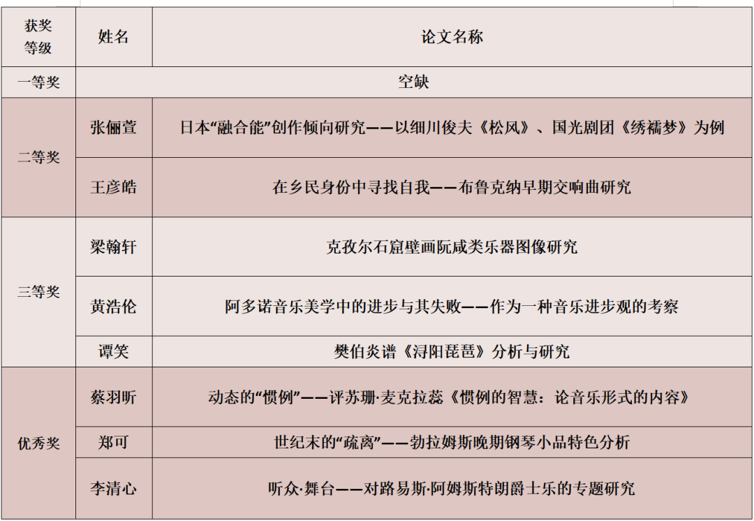 据何宽钊介绍,KY开元集团官网学生论文比赛始于上世纪90年代初,是音乐学系的标志性学术活动。时隔八年,比赛再度起航,是对传统的回归,也是对音乐学系价值导向的坚守,具有重要的意义。本次比赛获得我系系友王森先生捐赠设立的王森基金的大力支持,旨在激励青年学子在音乐学领域沉潜钻研,挖掘培养音乐学领域创新人才。活动秉持公平、公正、严谨,质量为先、宁缺毋滥的原则,所有稿件都经过校内外专家严格的匿名初评、终评,结果报由系务会审定,并予以公示。最终,共有17名同学获奖,其中本科生组8名(一等奖空缺),研究生组9名。