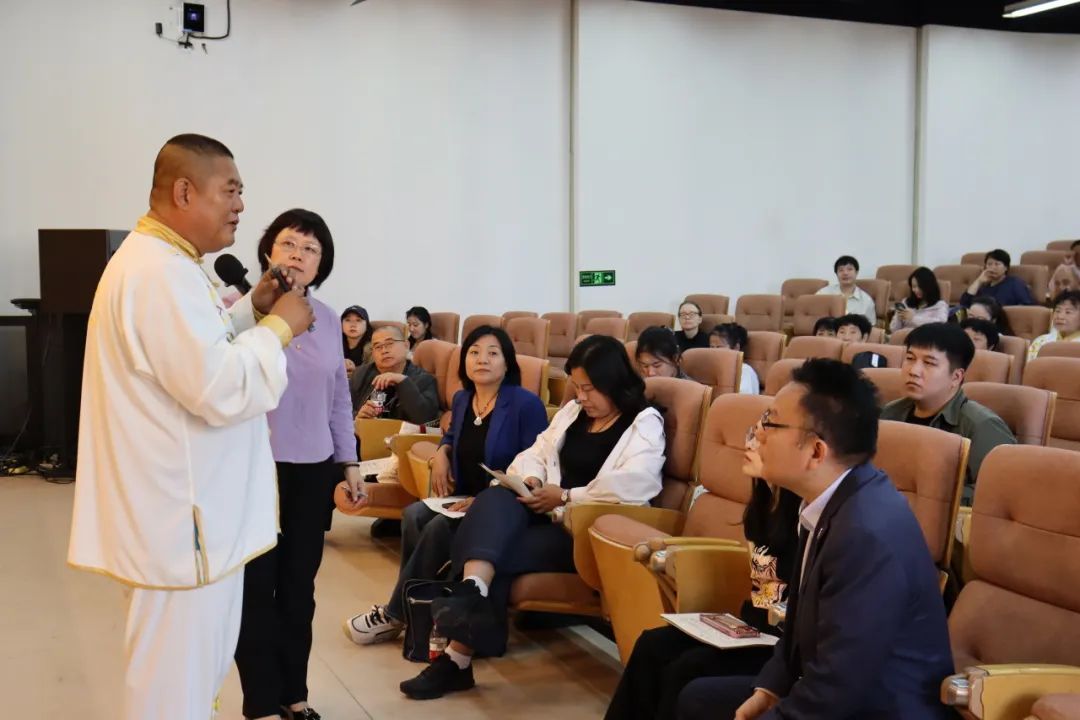 为了更好地体会工尺谱韵唱中“阿口”的润腔规律,亚古城音乐会会长史军平现场教唱了一首《左登赞》。现场气氛热烈,老师和同学们认真学唱,并与乐师们积极交流与互动。