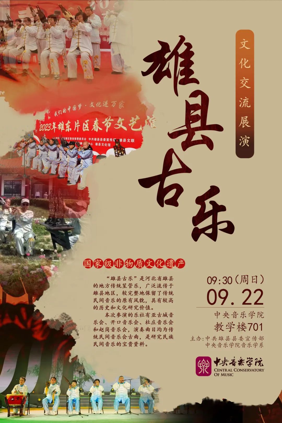 “雄县古乐”是指广泛流传于河北省雄县各个村落的传统笙管乐。2006年起,由雄县的亚古城音乐会、开口音乐会、杜庄音乐会和赵岗音乐会四个乐社,联合以“雄县古乐”为名申报省级非遗项目成功,后于2008年又进一步获批列入国家级非物质文化遗产名录。本次活动参演的正是这四家乐社。