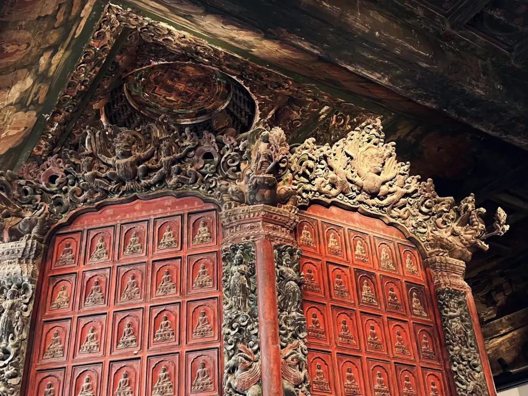 紧接着我们来到藏殿,抬眼便见一具精美、高大的明代转轮藏。这一珍贵的转轮藏高约4米,呈八边形。每一面都有九排五列的抽屉用于存放经书,而每一抽屉表面都浮雕一尊释迦佛像。我们惊叹于它的精湛工艺难以自拔,又在了解转轮藏中特殊的制作材料、绘画雕刻与文字雕刻后,为这座殿宇超凡的文化价值所深深震撼。