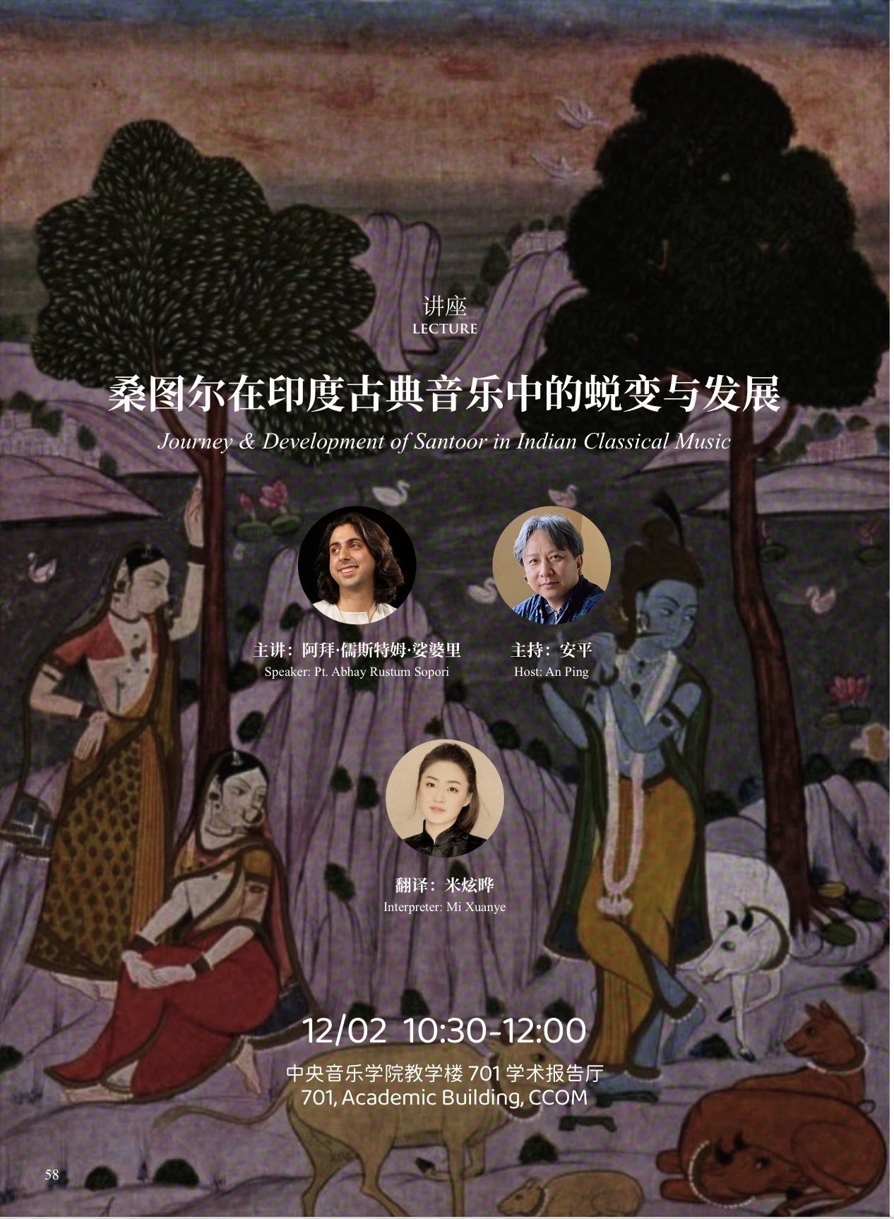 12月2日,正值KY开元世界民族音乐周第二天,上午11:00在KY开元教学楼701学术报告厅举办了《桑图尔在印度古典音乐中的蜕变与发展》主题讲座。本次讲座聚焦于桑图尔这一印度古典乐器,追溯了桑图尔如何由一件克什米尔宫廷乐器逐渐蜕变为印度古典音乐中的重要独奏乐器,展示了其古典化道路,介绍了桑图尔作为独奏乐器的突出优势及当代发展。讲座由印度杰出的桑图尔琴演奏家、作曲家阿拜·儒斯特姆·娑婆里教授主讲,瑞斯箱卡·乌帕哈亚作为娑婆里教授的搭档演奏帕克瓦吉鼓,音乐学系主任安平教授主持,米炫晔博士翻译。
