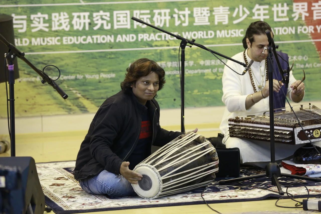 娑婆里教授紧接着更为具体地展示了桑图尔琴的古典化过程。他提到,娑婆里教授的父亲先是对桑图尔琴进行了形制的改革,将传统克什米尔桑图尔琴一个半八度的音域扩展为两个八度,增加了3个低音,使桑图尔琴的音域不再仅限于演奏克什米尔音乐;娑婆里教授的父亲又在此基础上加了一根印度古典音乐常出现的主音弦,使其更能适应演奏印度音乐。其次,娑婆里流派又开发出丰富的演奏技法,使桑图尔琴演奏出模仿声乐的复杂技法,如模仿印度声乐中的颤音、顿音,以及滚奏、抻、揉弦等方式,丰富了桑图尔琴的音色;娑婆里教授为了能够让击弦工具能好地展现桑图尔琴的音色,还改变了击弦工具的材质和质量。此外,娑婆里流派最大的特色之一就是复杂的节奏。印度古典音乐有着独特的复拍子节奏,也可以说桑图尔琴古典化道路上的关键点之一就是“玩节奏”,展现为多种印度古典音乐中的节奏和旋律的结合。为了使我们有更为直观的感受,娑婆里教授还为我们展示了他们流派高超的节奏技巧。他用桑图尔琴演奏复杂的节奏的同时,配上帕克瓦吉鼓,演唱印度音乐的旋律,展现出一个完善的拉格演奏形式。