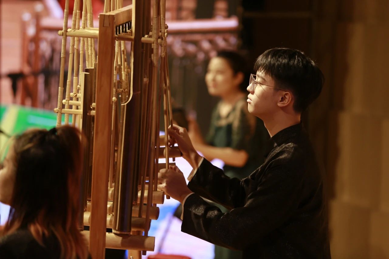 让我们把目光转向“竹乐传情”。《飞驰的鹰》《哎呦妈妈》《梅》通过印尼安格隆与中国竹笛的对话与融合,并采用现代创新型乐器音块,以及康加鼓、刮鱼、牛铃、克拉维等传统的拉丁打击乐器, 展现多元混生的节奏和音色。这种跨文化的演绎方式不仅赋予了传统音乐新的生命力,还强调了文化的多样性和相互尊重的重要性。正如参演本次音乐会的来自广州南方学院音乐系的何璐副教授所说:“在这个全球化的时代,用艺术的方式体现人类命运共同体也是非常有意义的。”