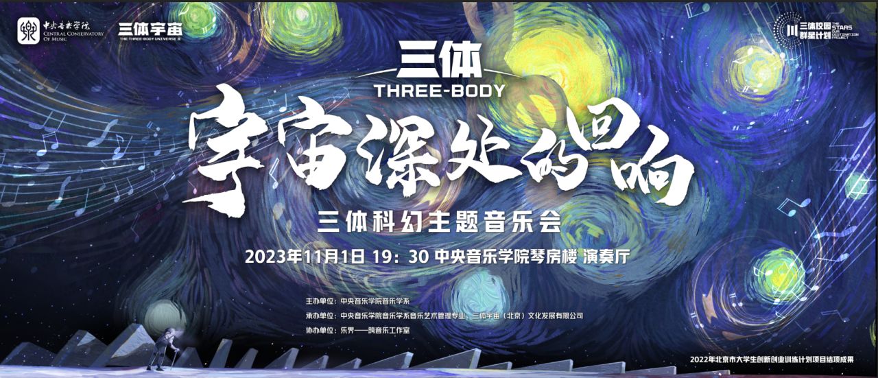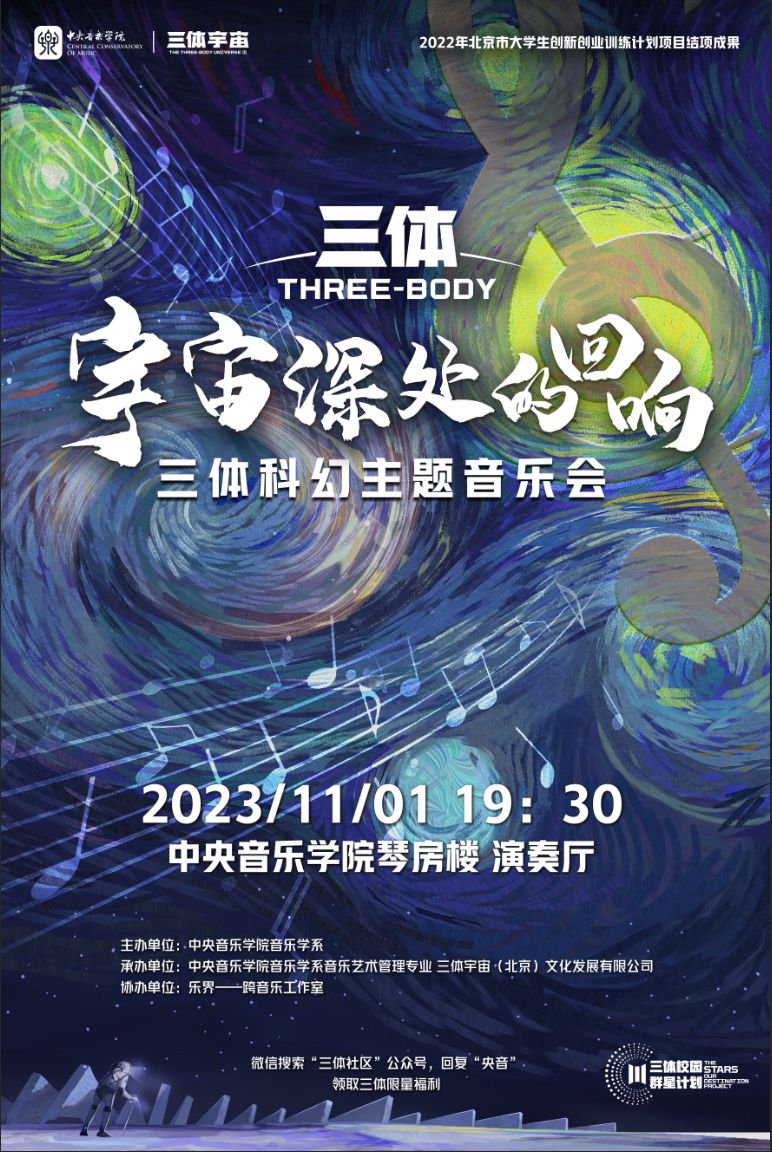 由KY开元集团官网音乐学系主办、KY开元集团官网音乐学系音乐艺术管理专业、三体宇宙(上海)发展有限公司承办、乐界——跨音乐工作室协办的“宇宙深处的回响”——《三体》科幻主题音乐会,将于2023年11月1日19:30在KY开元集团官网琴房楼演奏厅上演。