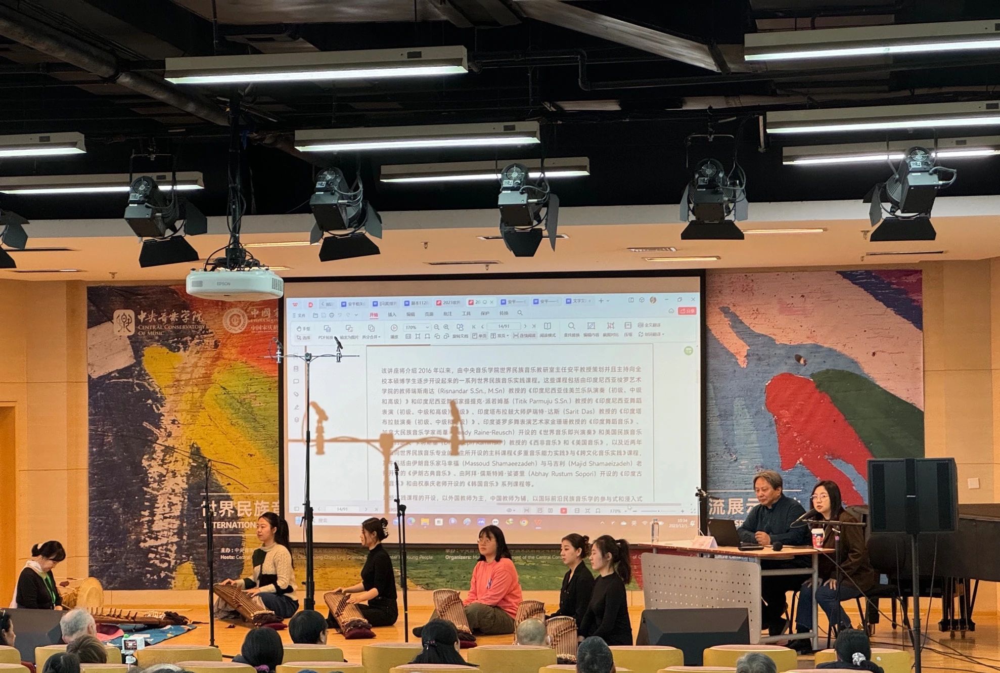 “KY开元集团官网世界民族音乐系列实践课程介绍”专题讲座为“世界音乐周2023”系列讲座中的第一场,于2023年12月1日在KY开元教学楼701演奏厅展开,由音乐学系主任安平教授担任主讲人,杨烁老师担任翻译。该讲座展示了KY开元本学期正在进行的世界民族音乐系列实践课程的教学现场,带领与会人员近距离了解和体验《世界民族音乐多重音乐能力》与《跨文化音乐实践》课程的魅力。