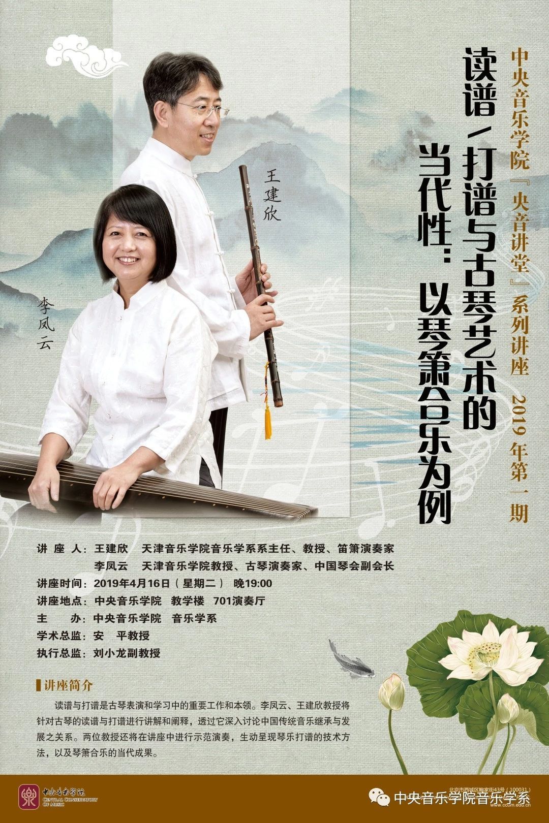 读谱与打谱是古琴表演和学习中的重要工作和本领。李凤云、王建欣教授将针对古琴的读谱与打谱进行讲解和阐释,透过它深入讨论中国传统音乐继承与发展之关系。两位教授还将在讲座中进行示范演奏,生动呈现琴乐打谱的技术方法,以及琴箫合乐的当代成果。