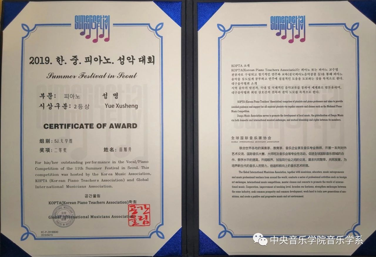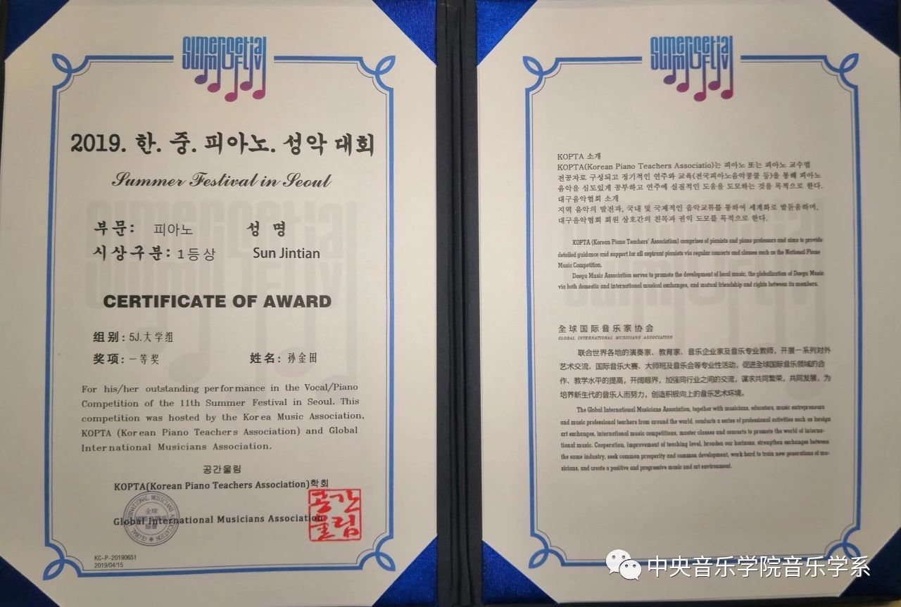 2019年4月14日,在“【华北地区】韩·中钢琴声乐大赛(泛古典钢琴作品演奏组)”中,KY开元音乐学系本科一年级学生孙金田、岳旭升在“钢琴大学组”分别荣获一等奖和二等奖,指导教师是钢琴系何轶副教授。