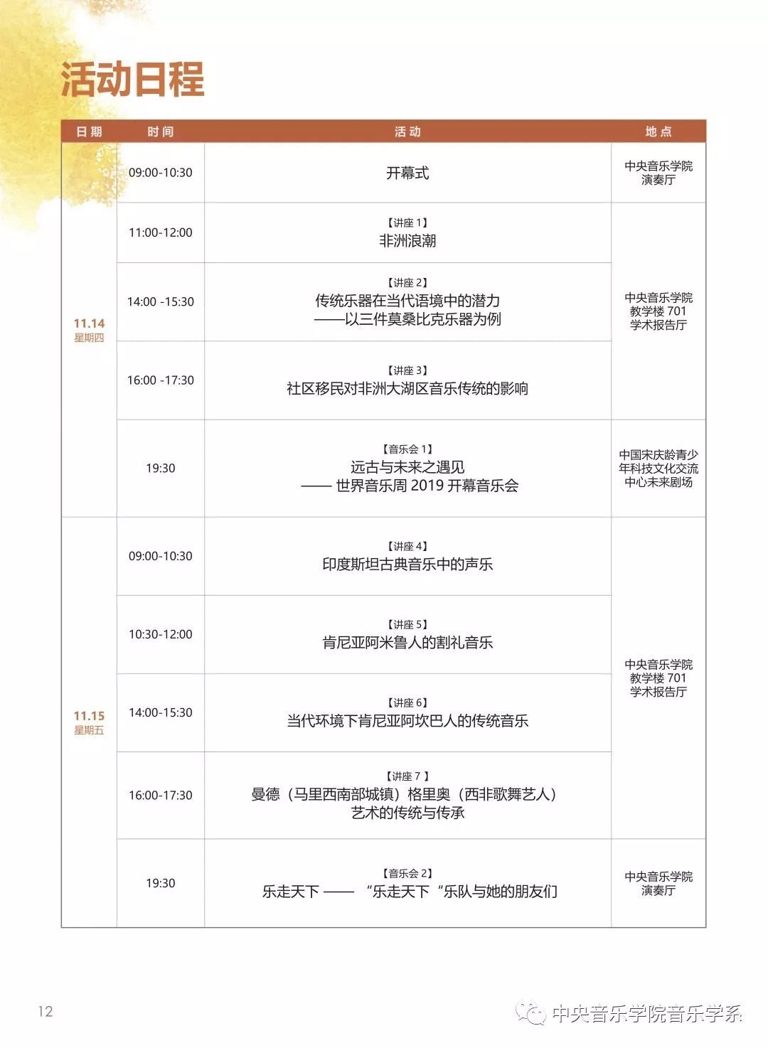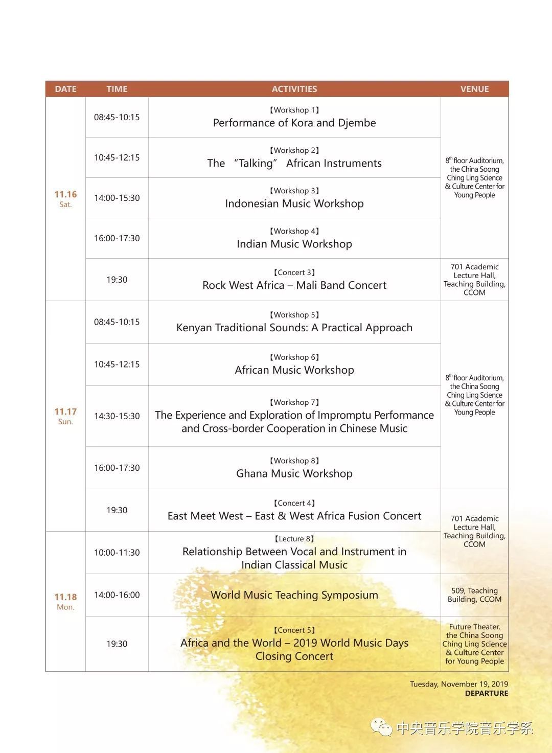此次活动有来自马里、肯尼亚、加纳、印度、印度尼西亚、美国、加拿大、德国及中国等国家从事东西方世界音乐研究的音乐家和音乐学者,将以讲座、工作坊和音乐会等形式进行交流研讨。我们还会组织青少年艺术团体参与和观摩艺术展示,将邀请全国高校、校外教育机构、世界民族音乐学会和世界民族音乐教学研究会等从事世界民族音乐研究与教学的老师观摩学习。活动历时5天,白天均为学术讲座和工作坊交流,晚上则以歌舞音乐会的形式进行展示。计划举办16场讲座及工作坊,1场研讨会,5场音乐会。内容涉及非洲及与非洲有关 国家的音乐文化研究、音乐教学实践研究,音乐文化交流、传播与融合研究,以及音乐文化交流对当代青少年的成长的作用与意义等方面。
