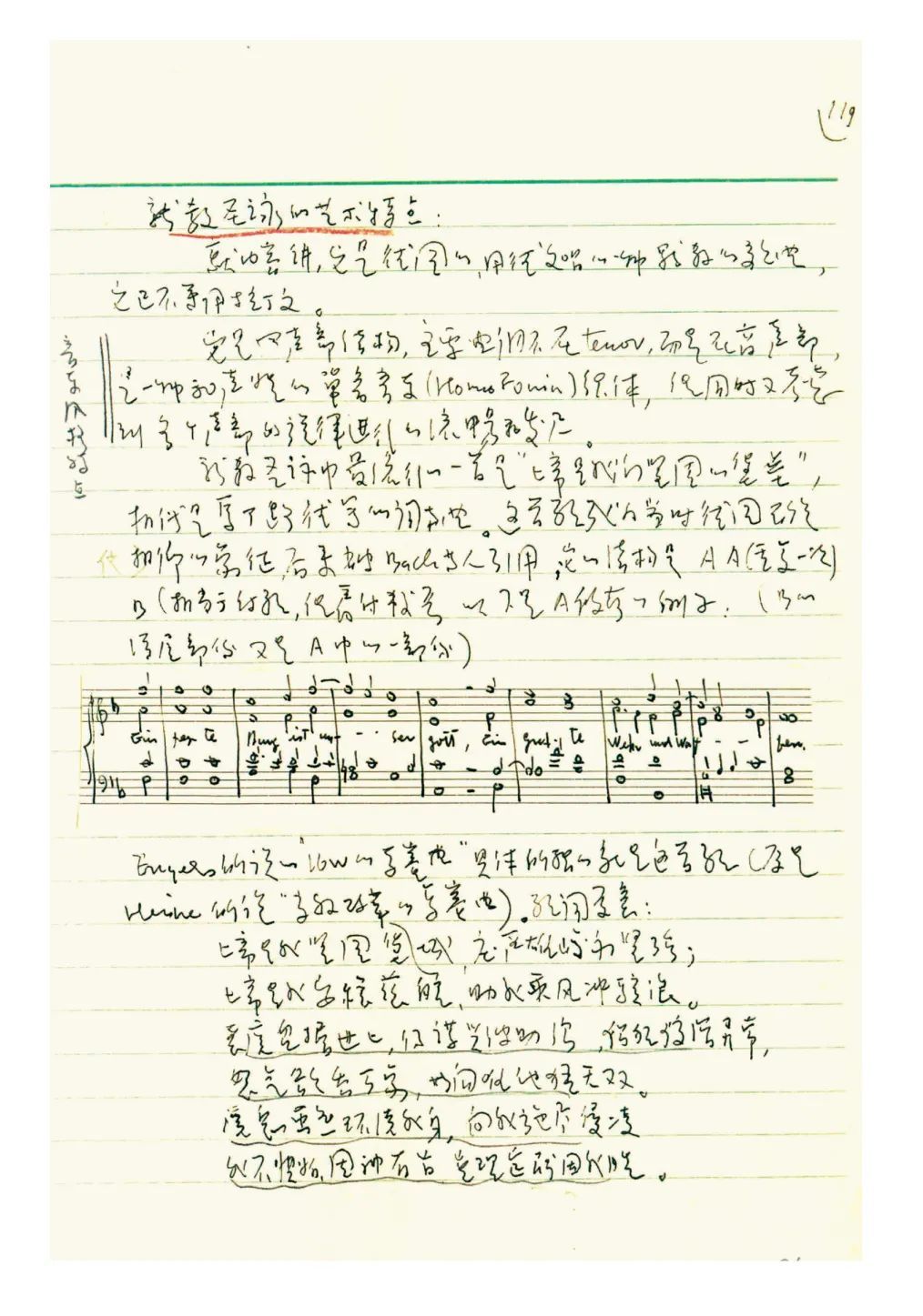 为了开设这门课,于润洋先生编写了近 2000页讲稿,共6章25节, 包含423条手绘谱例。从这沉甸甸的手稿和用钢笔绘制的乐谱中,可以看出于先生为开设这门课程所付出的心血。