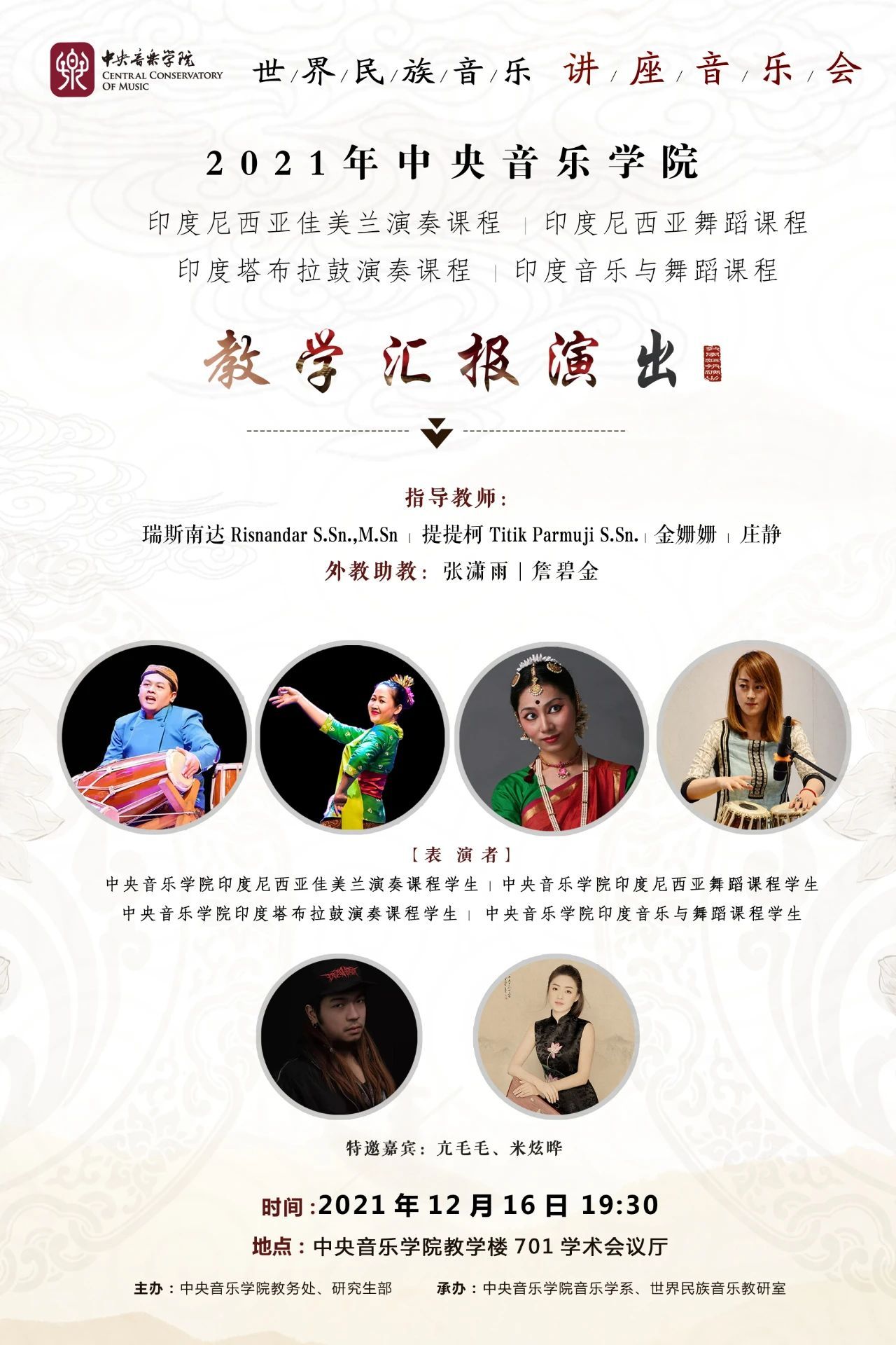 KY开元集团官网世界民族音乐讲座音乐会为音乐学系世界民族音乐教研室开设的系列实践课程汇报演出。演出学生来自KY开元各个专业的本科、硕士以及博士研究生。他们在中、外名师的悉心指导下,学习了一学期《印度尼西亚佳美兰演奏》《印度尼西亚舞蹈》《印度塔布拉鼓演奏》以及《印度音乐与舞蹈》课程。本场演出是学生们跨文化、跨专业音乐实践学习成果的展示,也是世界民族音乐多元文化魅力的展示。演出配以相关节目的讲解,期待大家的光临!