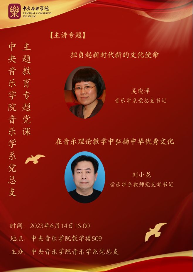 第二场党课讲座将由音乐学系党总支书记吴晓萍教授与教师党支部书记刘小龙教授分别以“担负起新时代新的文化使命”和“在音乐理论教学中弘扬中华优秀文化”为题展开。