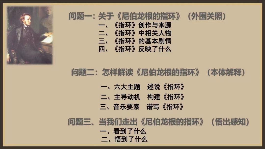杨九华教授将本次讲座的内容分为三部分,每个部分围绕一个主要问题展开,即“关于《指环》”,“解读《指环》”和“走出《指环》”。(见图3)杨九华教授用生动的语言为我们展现了这部史诗般作品中的恢弘叙事,以及瓦格纳在神话传说中融入的深刻隐喻。