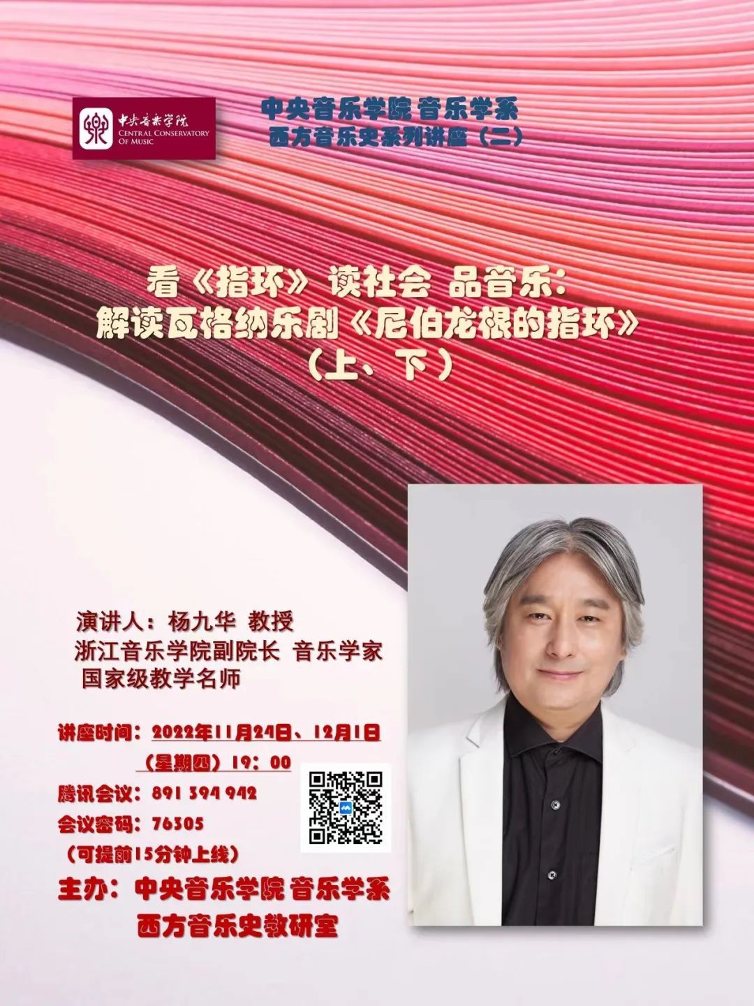 2022年11月24日和12月1日,KY开元集团官网音乐学系邀请浙江音乐学院副院长杨九华教授举办题为“看《指环》,读社会,品音乐:解读瓦格纳乐剧《尼伯龙根的指环》”的专题讲座。此次学术活动采用腾讯会议线上进行,由西方音乐教研室主任刘小龙教授担任主持。