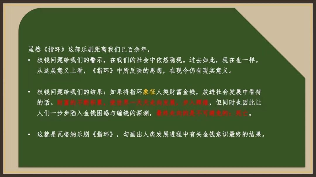 | 《指环》中权钱问题对现世的启示最后,杨九华教授用“从《指环》中悟到了什么”为我们梳理并总结了这场讲座的核心内容——看《指环》,读社会,品音乐。在宣讲结束之际,杨九华教授以这样的一段话作为结语: |