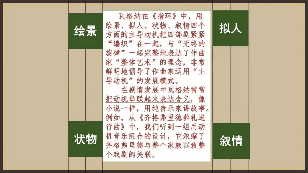 瓦格纳在《指环》中设下的隐喻在音乐方面则体现为主导动机的使用和新颖的音乐要素。杨教授将《指环》中的主导动机分为四类:绘景、拟人、状物和叙情,瓦格纳通过使用主导动机以及主导动机的融合和转换,表现了乐剧中涉及的人物、情节或物体等重要主体的内容与不同主体之间的关系(例如齐格蒙德的主导动机中蕴含着象征瓦哈拉的主导动机,以暗示他的身份;矛的主导动机中蕴含着众神毁灭动机等)。