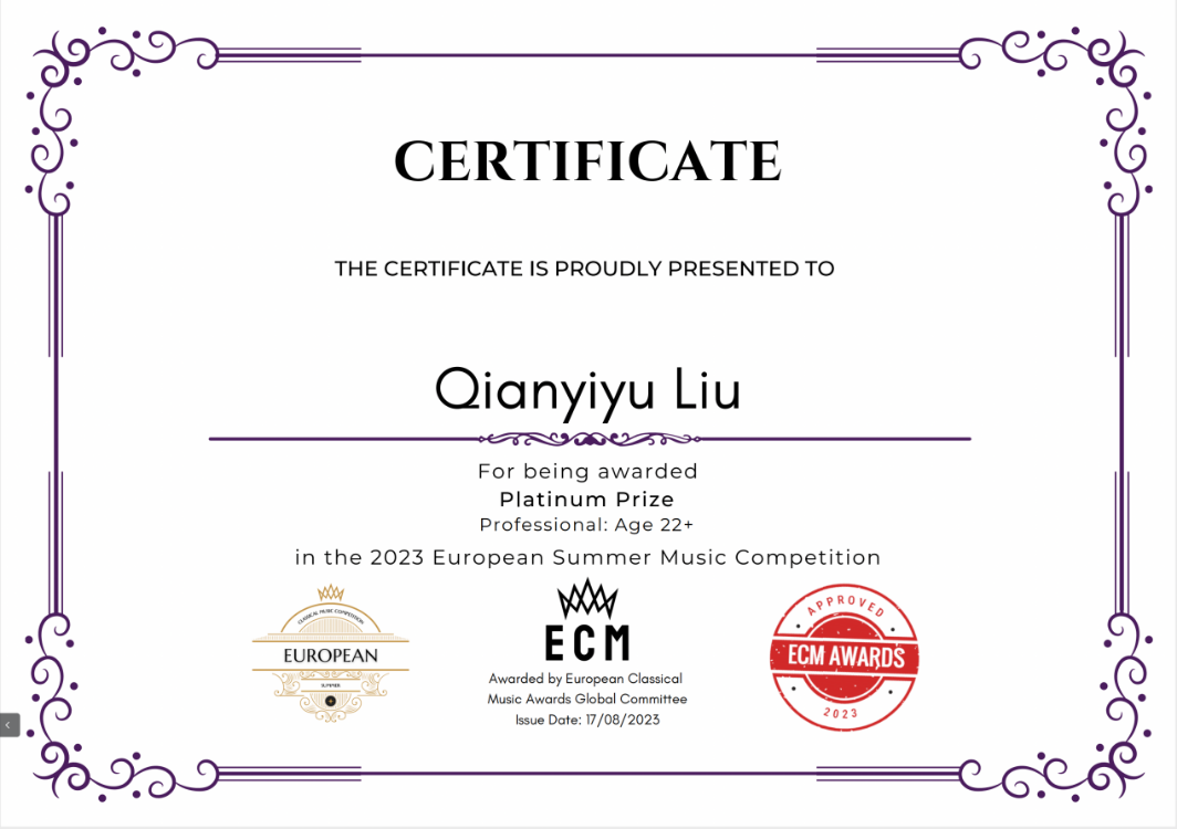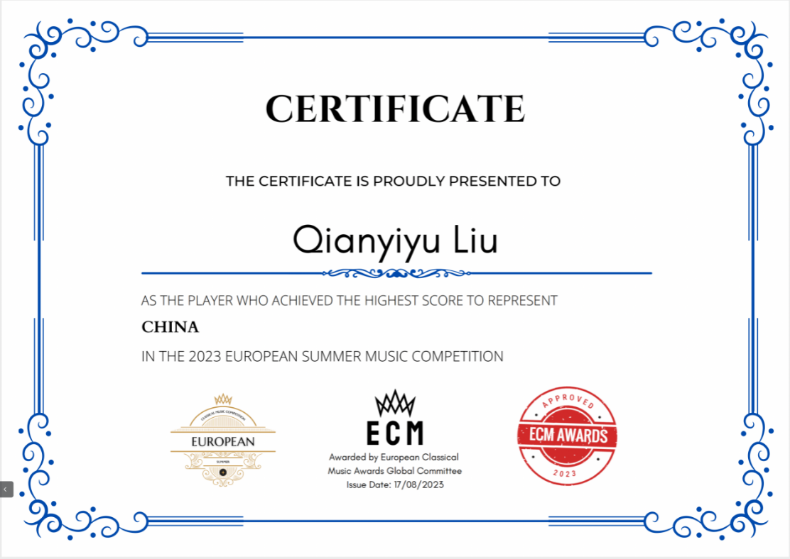 欧洲夏季音乐大赛(European Summer Music Competition)始于1994年,是由欧洲古典音乐奖委员会(European Classical Music Awards Committee)举办的一场面对全世界音乐家的比赛,评审团的成员均由国际知名人士组成,其中包括雅马哈艺术家Stathis Mavrommatis、法国“Châteaubriant”音乐学院教授Avguste Antonov和上海音乐学院教师耿文彬等共22位来自世界各地音乐家、乐队成员和学院教授。比赛对所有多数专业如声乐、作曲、指挥和室内乐开放。同时参赛者的表演将得到评委团的评价和反馈,以帮助他们在音乐发展中取得进步。