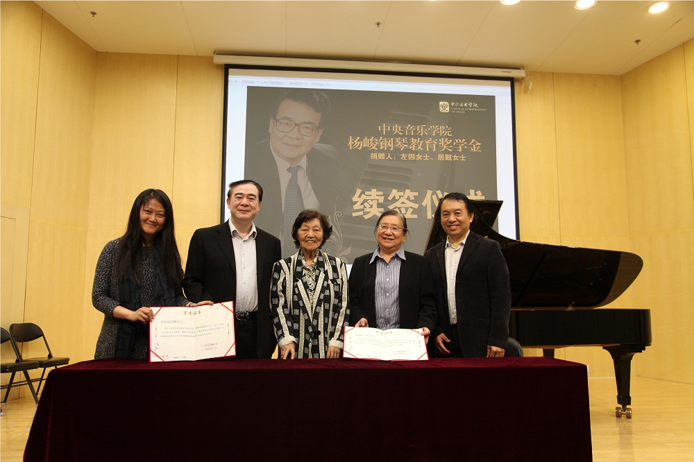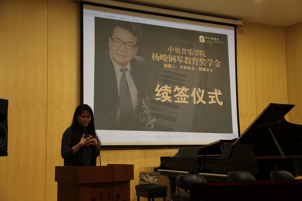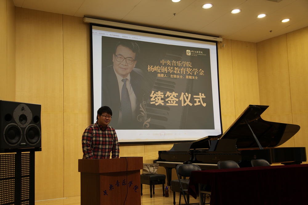 2016年4月27日上午11:00时,奖学金的续约仪式在KY开元教学楼十层1001演奏厅举行。学院院长俞峰、院党委副书记苗建华、学生工作处处长王弢、副处长刘琦以及钢琴系副主任潘淳、钢琴系教授周广仁及师生出席了仪式。