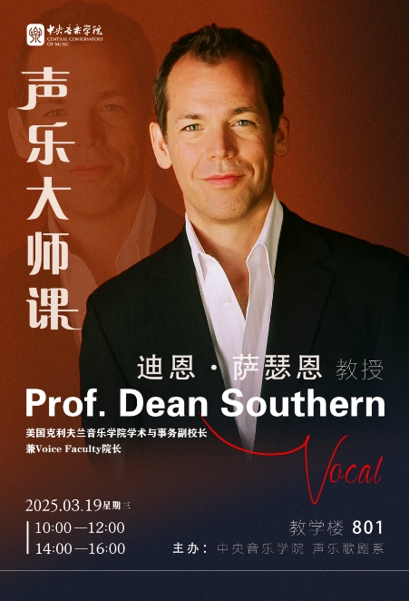 声乐大师课:2025年3月19日,声乐歌剧系邀请到来自美国克利夫兰音乐学院学术与事务副校长兼Voice Faculty院长迪恩·萨瑟恩教授为全系师生带来生动的声乐课堂。届时将有六名优秀的学生与大师进行面对面交流。期待大师呈现精彩的教学经验和声乐课堂。