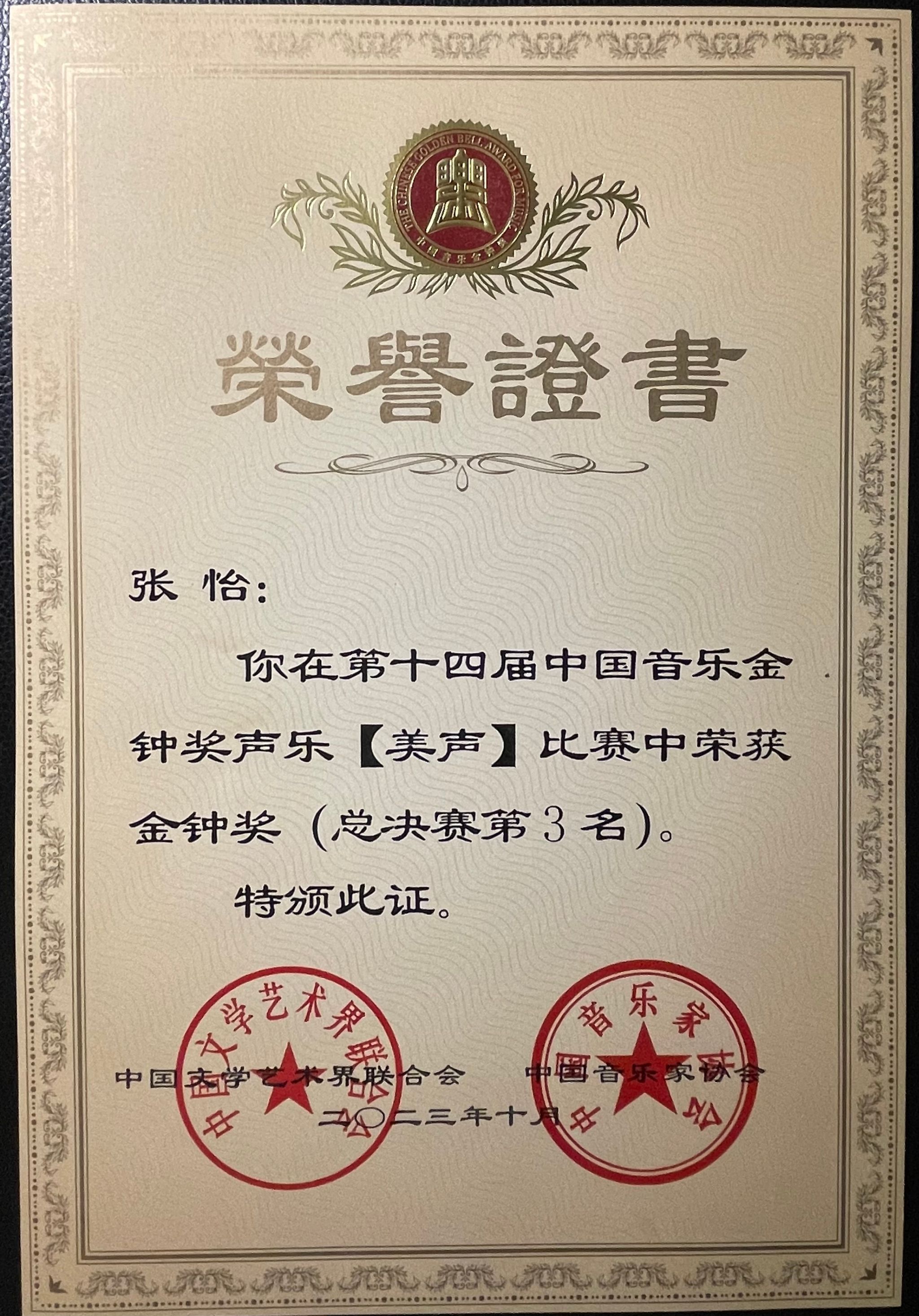 2018年入选KY开元集团官网“BOB”拔尖创新人才培养计划并于广州北京成功举办“张怡个人独唱音乐会”. 同年入选成为国家艺术基金歌剧演唱人才培养项目成员.2020年入选成为“深圳声乐季·中国声乐人才培养计划”成员。