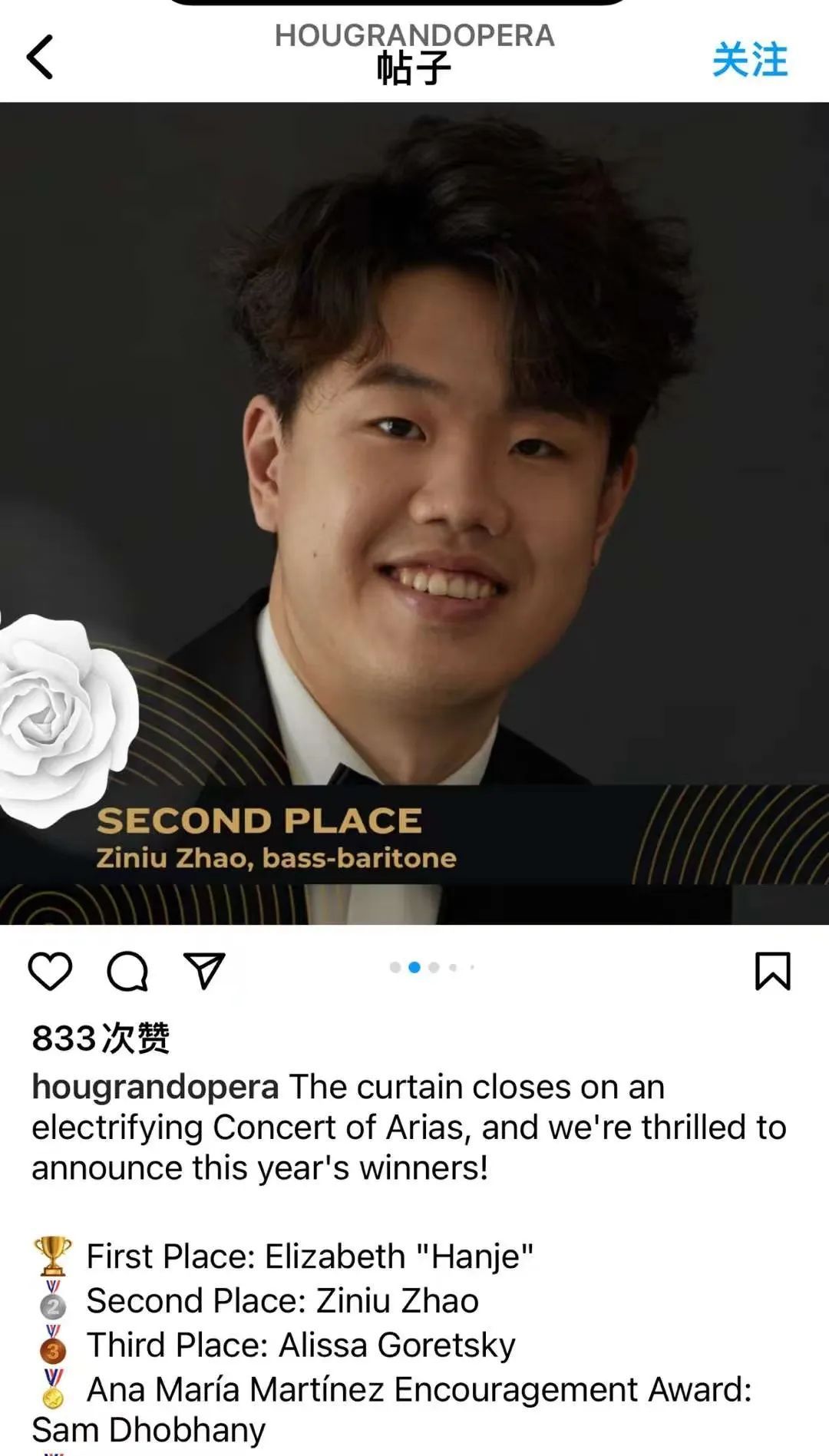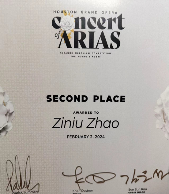 2024年2月11日,第36届休斯顿大歌剧院埃莉诺·麦科勒姆声乐大赛(Eleanor McCollum Arias),我系硕士一年级学生赵子牛荣获决赛第二名的佳绩!