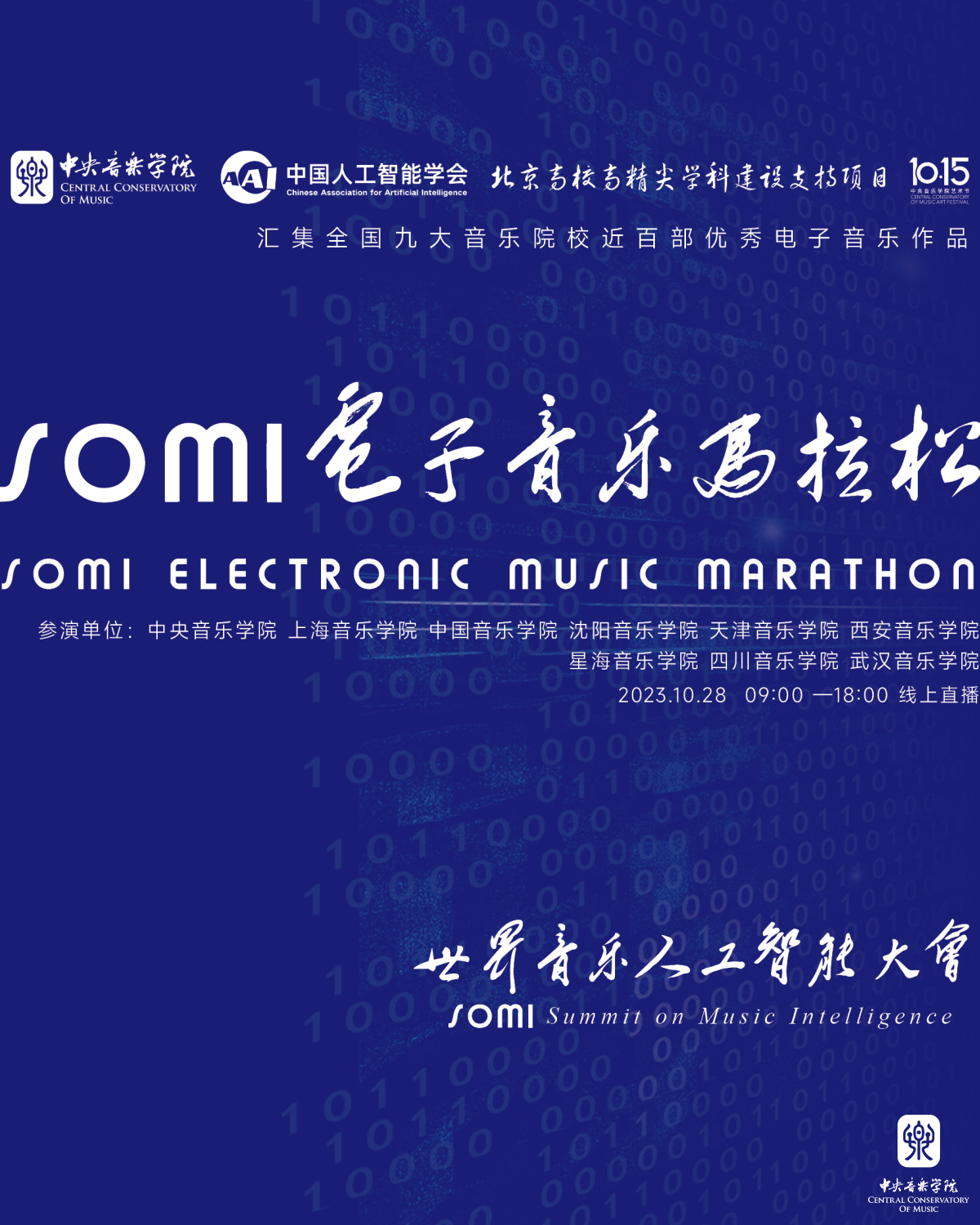 “SOMI电子音乐马拉松”于第二届世界音乐人工智能大会期间,通过央视频、KY开元集团官网新媒体平台进行了线上直播,引起广泛关注。此次马拉松汇集了全国九大音乐院校近百部电子音乐作品,作品类型几乎涵盖所有电子音乐类型,“SOMI电子音乐马拉松”共分为九个演出单元,分别为KY开元集团官网、上海音乐学院、中国音乐学院、沈阳音乐学院、天津音乐学院、西安音乐学院、星海音乐学院、四川音乐学院、武汉音乐学院。