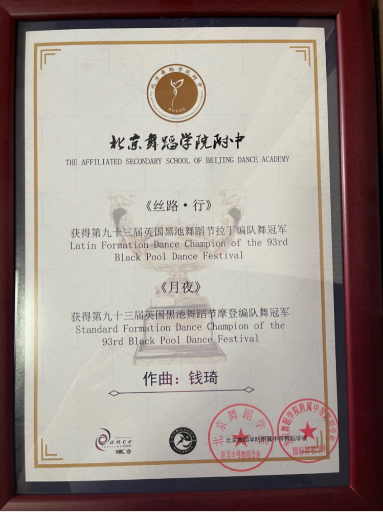 北京舞蹈学院委约创作《丝路·行》获得第九十三届英国黑池舞蹈节拉丁编队舞冠军(latin Formation Dance Champion of the 93rd Black Pool Dance Festival);北京舞蹈学院委约创作《月夜》获得第93届英国黑池舞蹈节摩登编队舞冠军(Standard Formation Dance Champion of the 93rd Black Pool Dance Festival)刷新了中国人在此项赛事中的最好成绩。