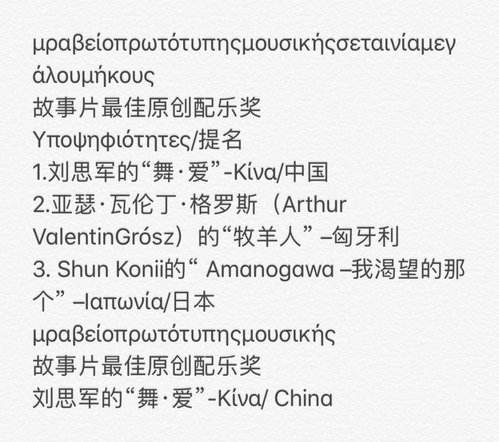 该片于2019年报名参加希腊布里其斯电影节,在2000余部影片遴选中脱颖而出,入围主竞赛单元,音乐提名奖共三人,另两位是匈牙利和日本作曲家,最终在1月25日的颁奖中《舞爱》获得了最佳音乐奖。由于疫情的原因,奖杯和证书终于在几个月之后辗转寄到国内,是一份迟来的喜讯。