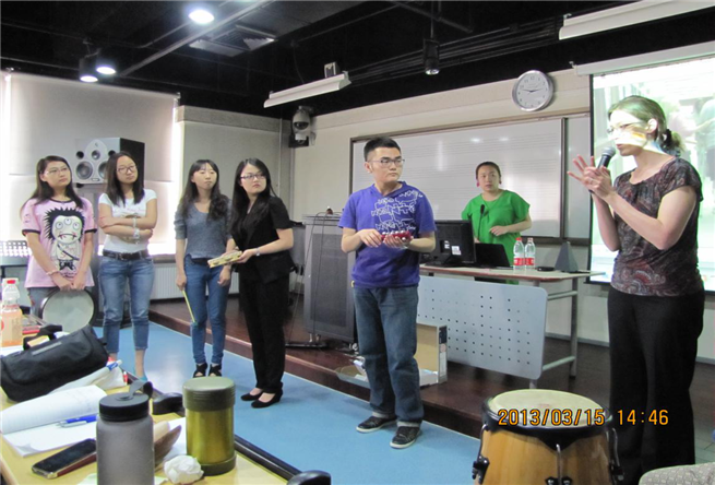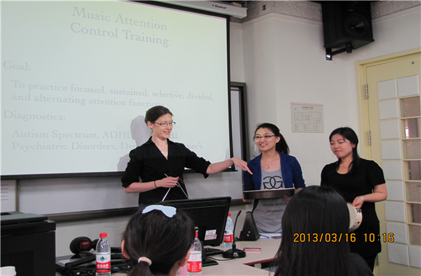 LaGasse教授15日的课程集中介绍了音乐与人体生理的关系、何为神经音乐治疗,展示了各个国家的神经音乐治疗视频。课堂设计了很多与同学互动的环节,这些活动让同学们更生动详细地了解了神经音乐治疗的各种方法。